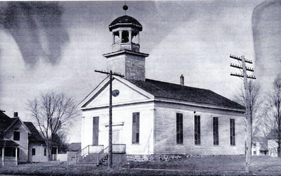 Scans of DeWitt area postcards. 30-A Looking Glass River and bridge; 30-B Shoveling out from a snow storm; 30-C Interurban at Alward Lake; 30-D Baptist Church of DeWitt 1912.