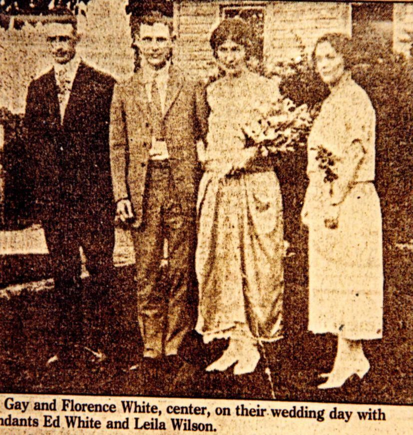 Newspaper article on wedding of R. V. Gay and Florence White. Attendants were Ed White and Leila Wilson. copy