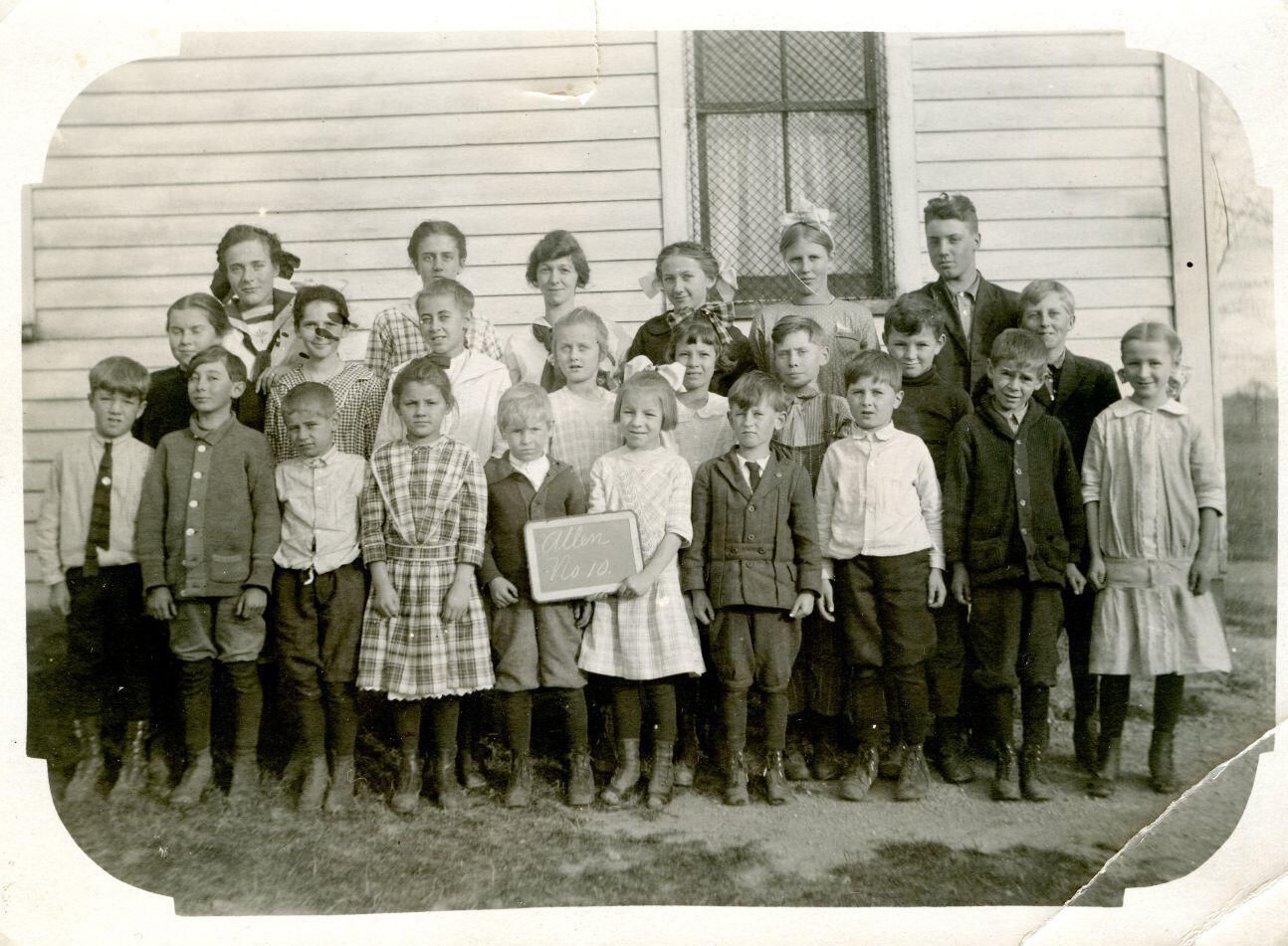 Allen School, Watertown Township, November 8, 1915. Gladys E. Stampfly (teacher); Absent from photo were Mildred Knaup, Robert Bennett, and Leon Trierweiler. (back) Lola Cramer, Minnie Schray, Gladys Stampfly, Emma Felzke, Belva Berg, Glen Bennett, (middle) Helen Feightling, Virginia Summers, Hazel Kowalk, Gladys Burke, Bertha Trierwieler, Lawrence Feightling, Herbert Kowalk, Arthur Knaup, (front) Frederick Trierwieler, Clarence Bauerle, Henry Kowalk, Julia Bennett, Bennett, Lorna Burke, Fred Knaup, Donald Burke, Archie Kowalk, Edna Burke.