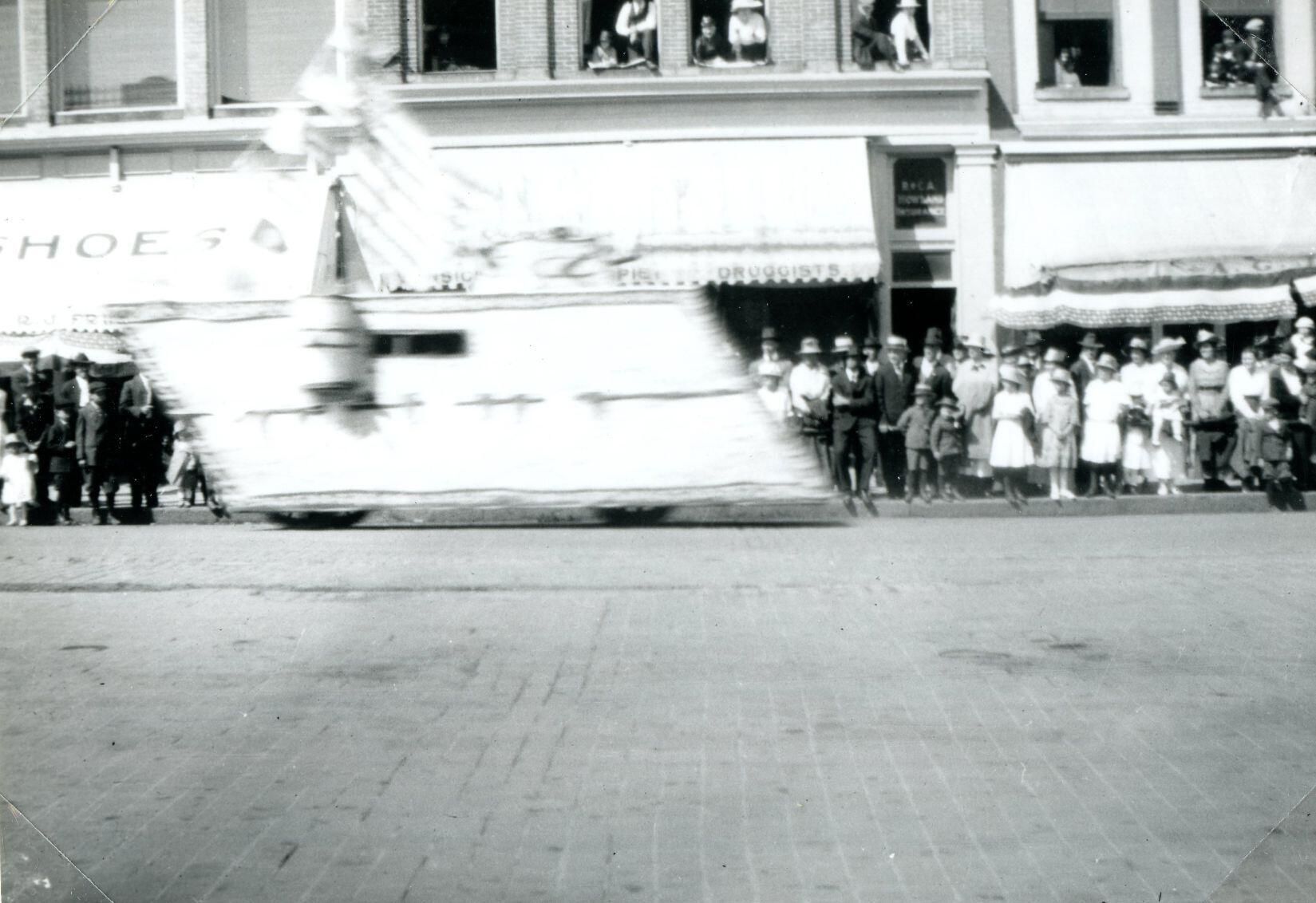 Armistice Day Parade in St. Johns on November 11, 1919. In front of Glaspie & VanSickle Drugs, Rollie Frink's Shoe store, and Hulse Shoe Repair. Florence and Catherine Glaspie in window above drug store. Photo taken by Mertie Bishop of Greenbush Township.