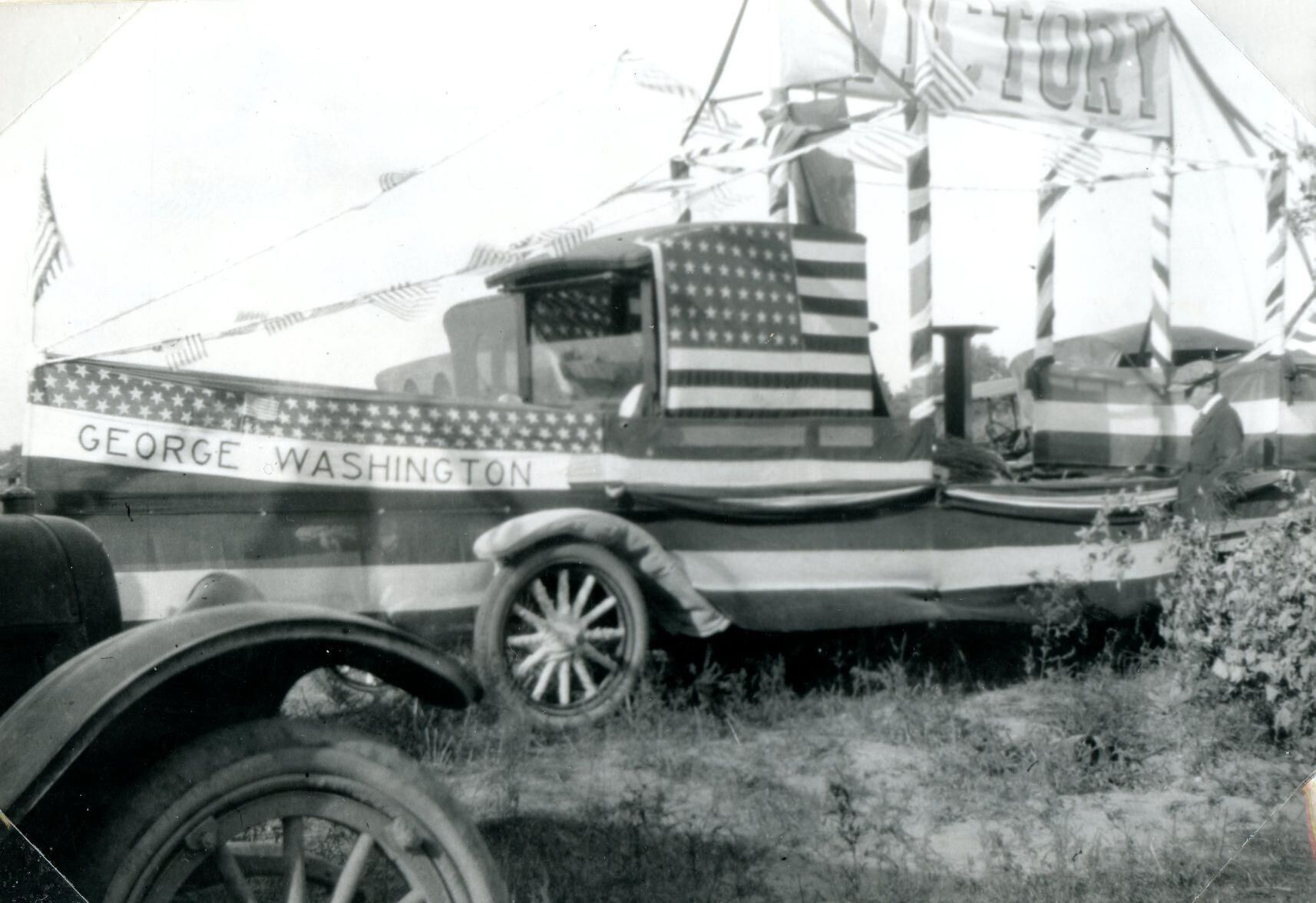 Armistice Day Parade, St. Johns, November 11, 1919. A float parked in Emmon's Woods (later St. Johns City Park) after the parade ended. Photo taken by Mertie Bishop of Greenbush Township.
