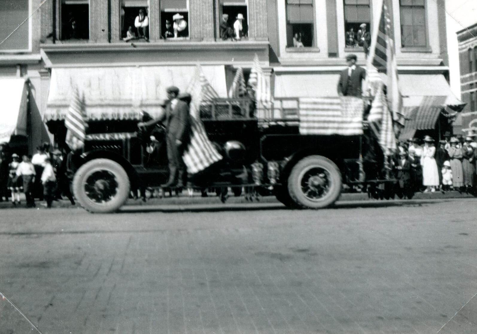 Armistice Day Parade at St. Johns on November 11, 1919. St. Johns fire department truck passing in front of Allie Jones Grocery and Glaspie & VanSickle drug store. Photo taken by Mertie Bishop of Greenbush Township.
