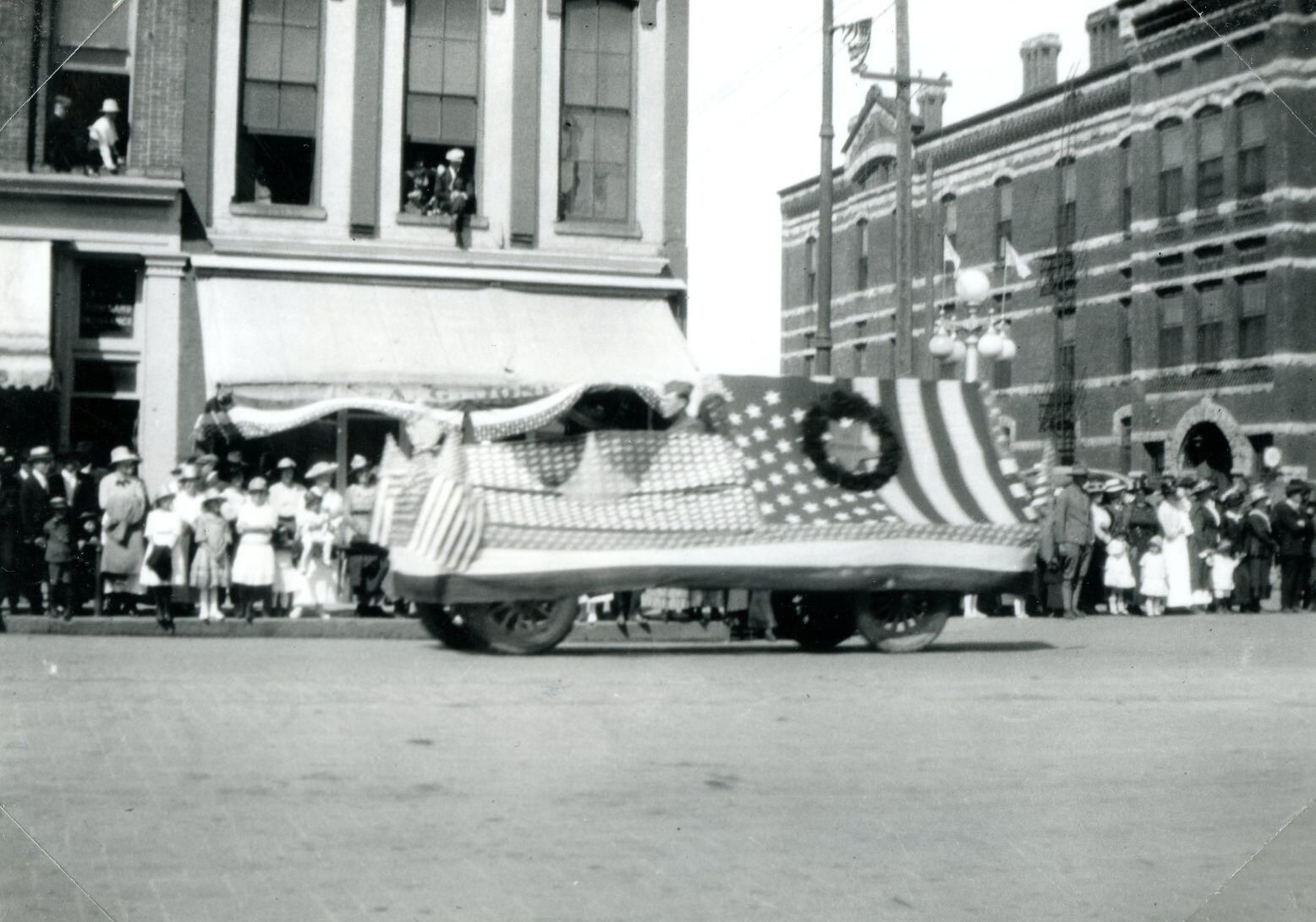 Armistice Day Parade at St. Johns on November 11, 1919. Steel Hotel in background. Photo taken by Mertie Bishop of Greenbush Township.