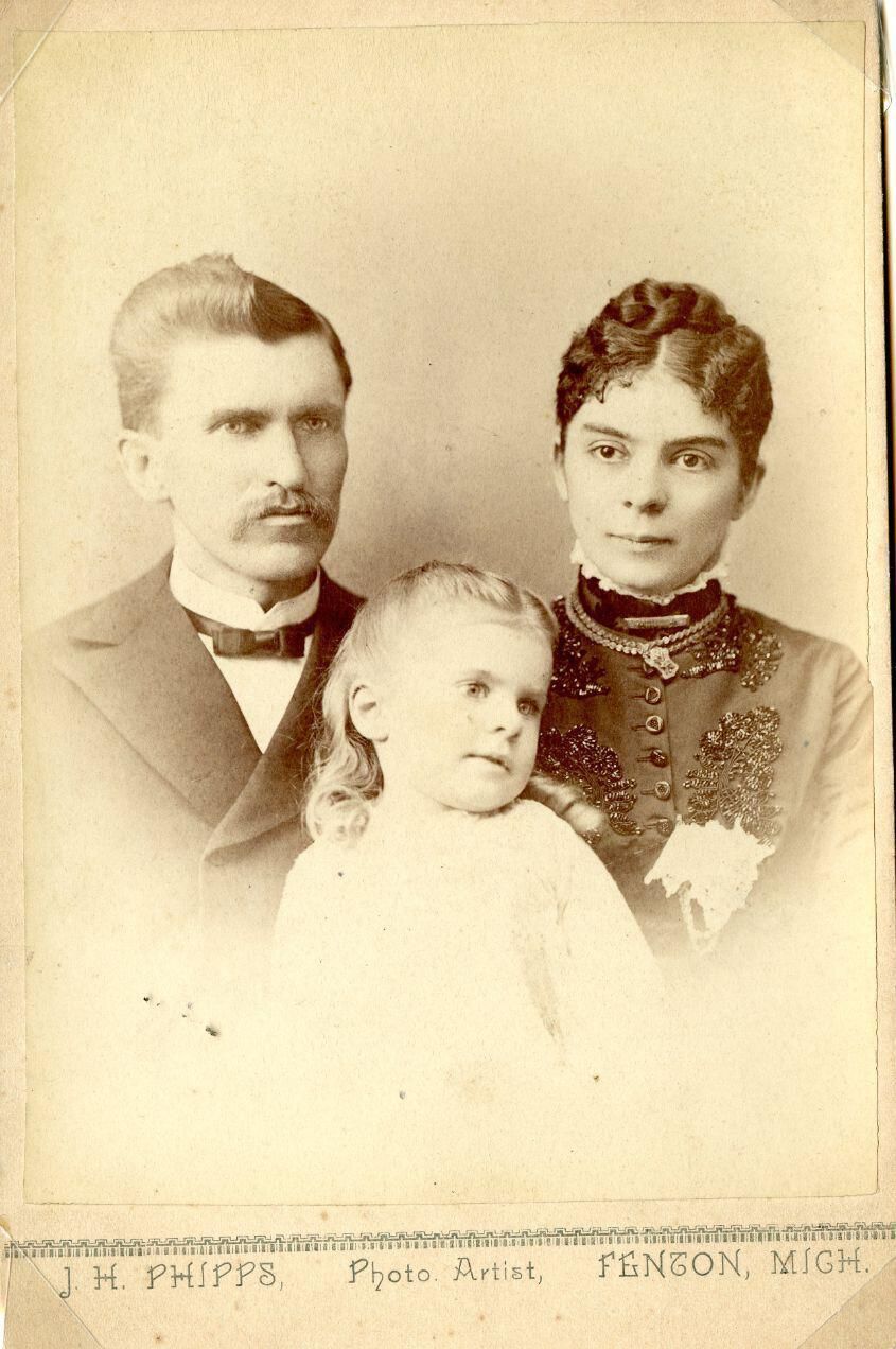 Rev. Charles W. Barber, Mabel Barber, and Mary Clementine "Clemma" (Woodard) Barber. Taken by J. Phipps of Fenton, Michigan. [identifications assumed.] Probably c1886