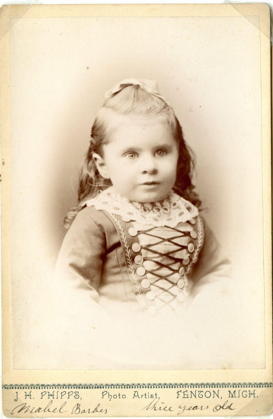 Mabel Barber age 3 years. c1887. Daughter of Rev. Charles W. and Clemma Barber. Photo by J. H. Phipps of Fenton, Michigan.