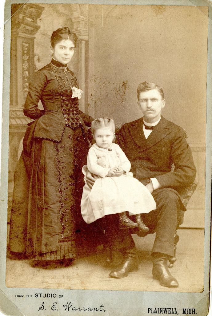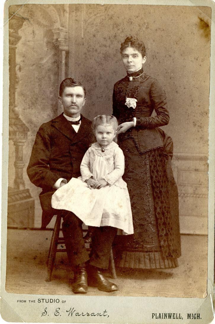 Mary Clemintine "Clemma" (Woodard) Barber, Mabel [assumed], Rev. Charles W. Barber. Photo by S. E. Warrant, Plainwell, Michigan.