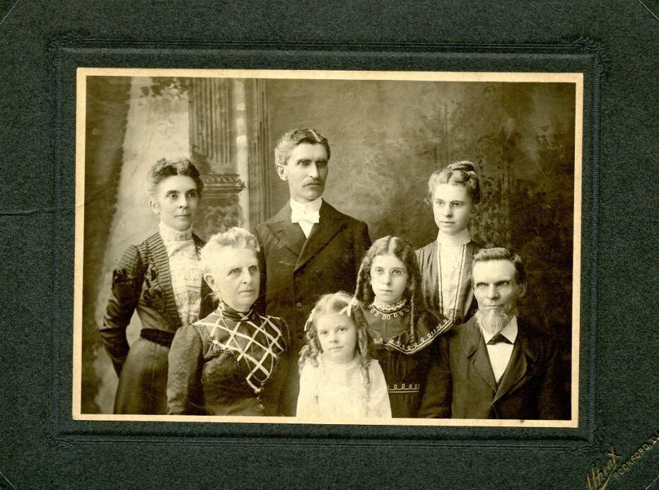 Barber family. Rev. Charles W. Barber, Clemma (Mary Clementine Woodard) Barber, Mabel Barber, Ethel Barber, Hazel Barber, and Clemma's parents Orin Woodard and Melissa E. (Stratton) Woodard. [identifications are assumed] Taken by Wheat of Rockford, Illinois. c1900.