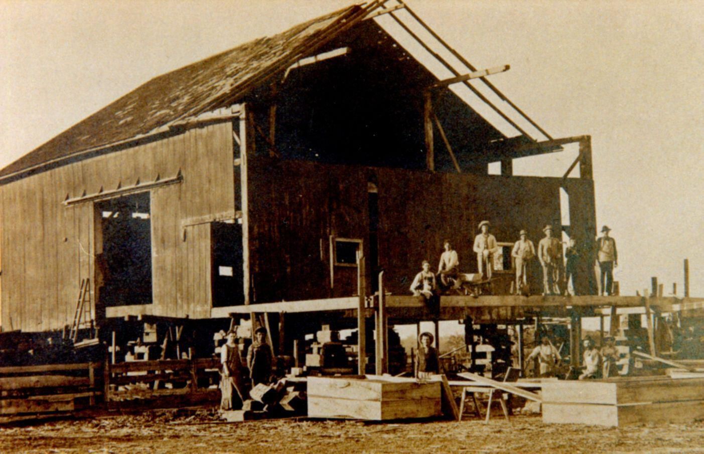 Barn raising on Travis farm at Essex Center c1910. (standing) Carl and Minnie (Vause) Staub, James Freer, (on wheelbarrow) James Staub. Tom Staub with axe. Carl Staub repaired and expanded existing barn damaged by a tornado.