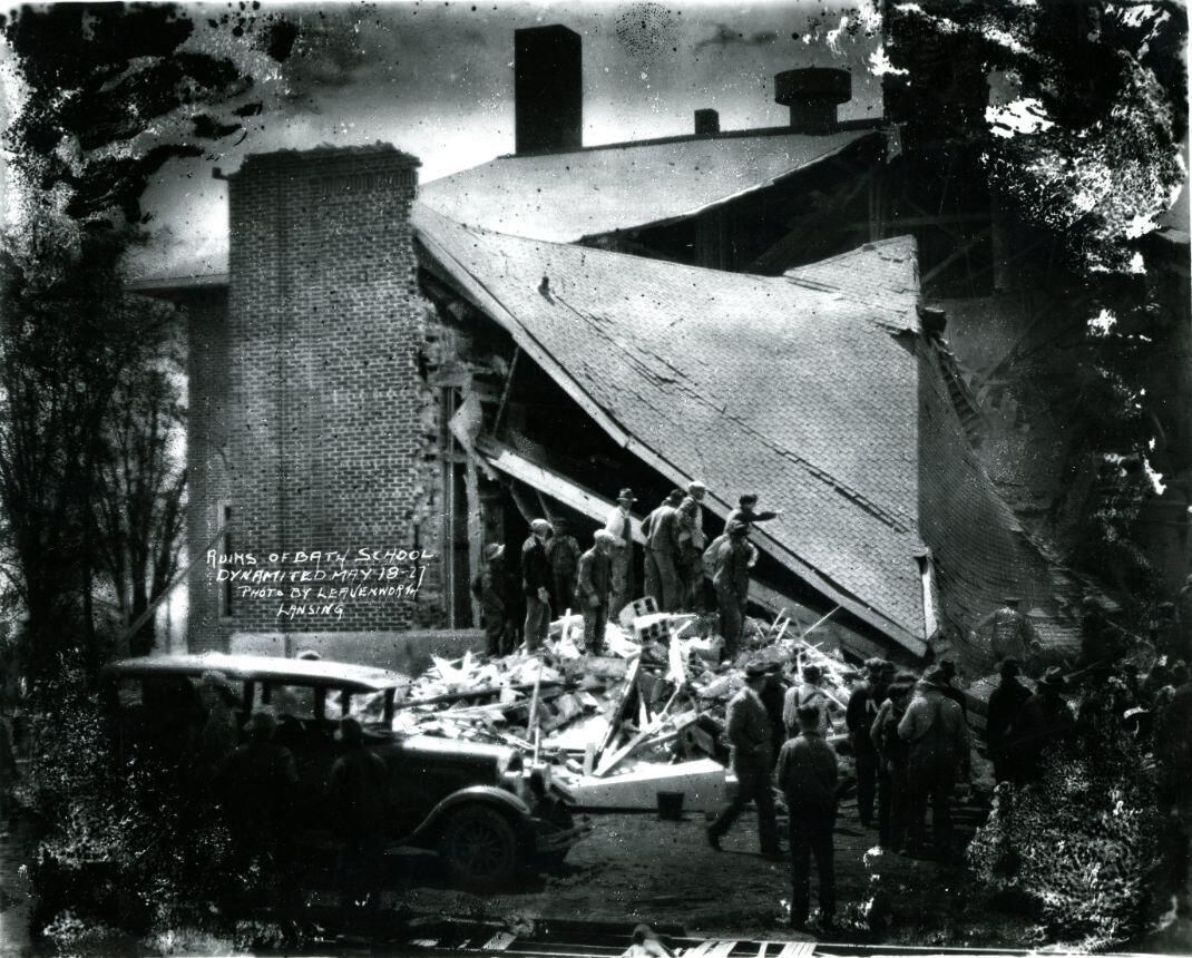 Ruins of Bath School, Dynamited May 18, 1927. Photo by Leavenworth, Lansing, Michigan