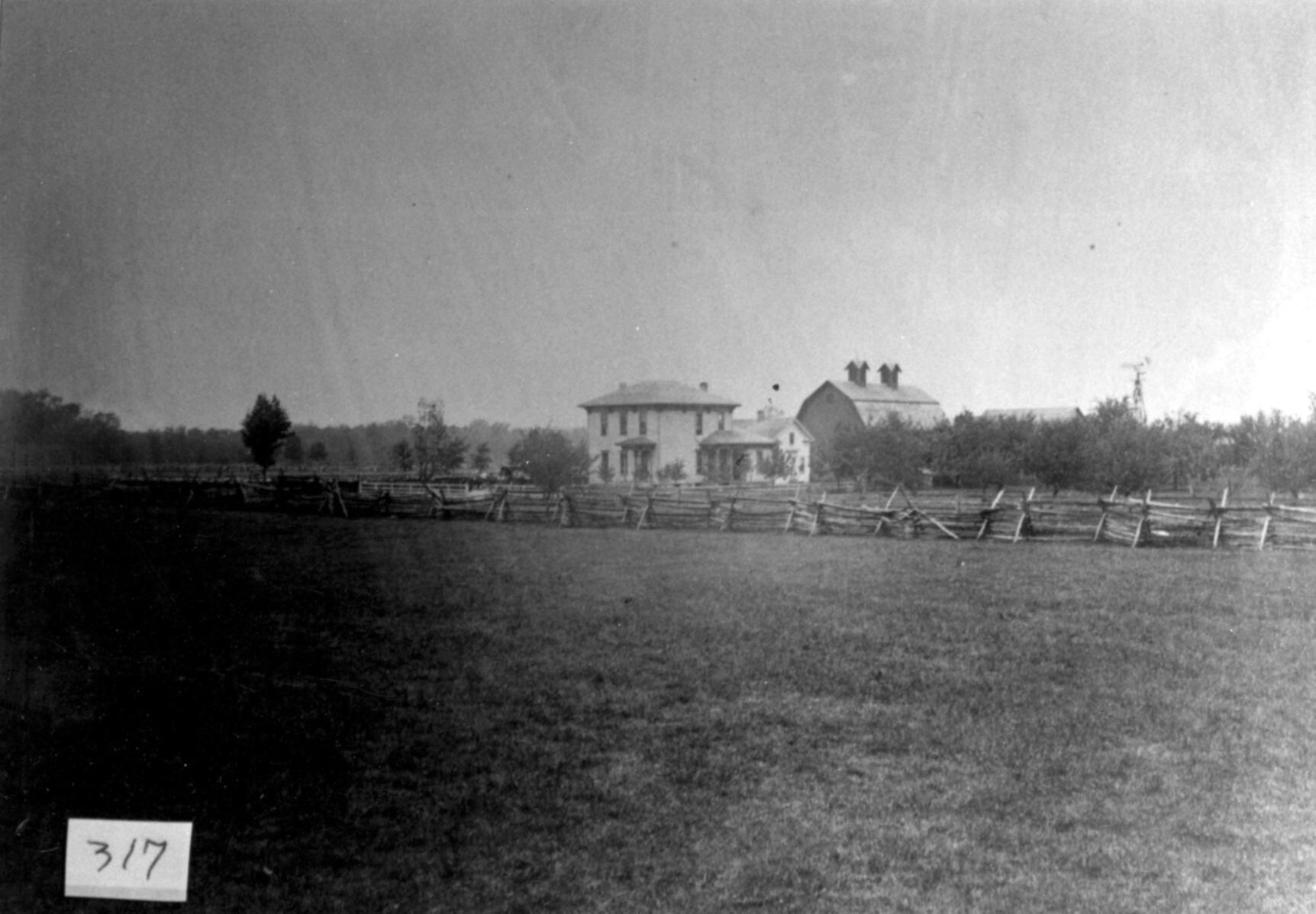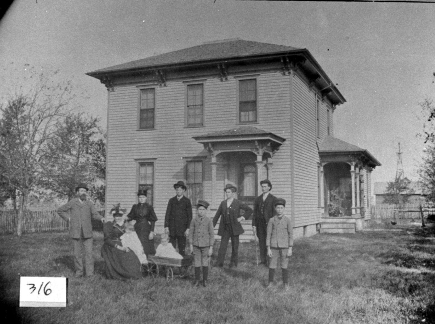 316 Home of John A. Beck on Hyde Road, 3 miles east of US-127, c1894. John A. Beck, Mary Jane Beck, Verna Beck (held), Martha Beck, Albert Beck (in wagon), Oliver Beck, Guy Beck, Frank H. Beck, Gilbert Beck, and Roswell Beck. 317 John A. Beck farm. copy