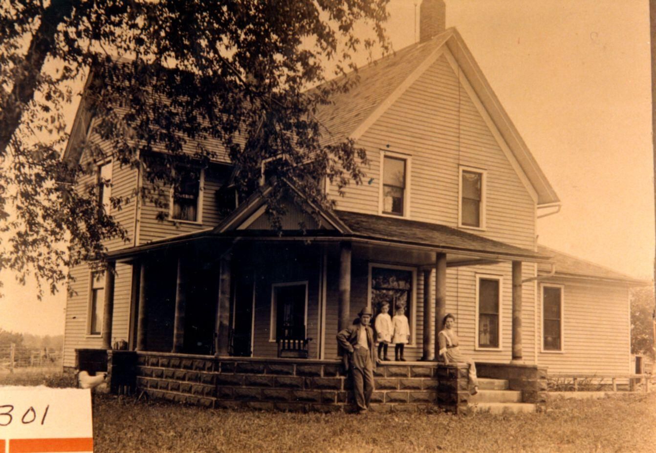 Home of Frank H. and Edna (Crom) Beck built in 1909. Twin boys age 5 are Maynard and Gaylord Beck. Located 8 miles north of St. Johns. Photo from 1913. copy