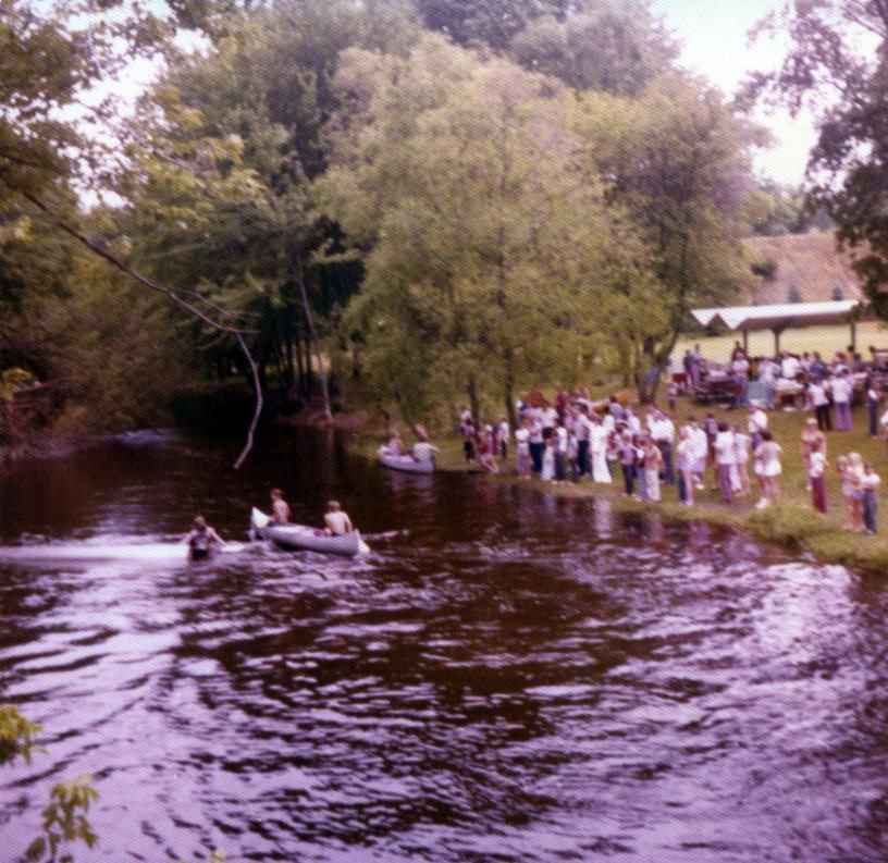 Finish of canoe race at Riverside Park on July 3, 1976. Phot by Ralph Woodruff.