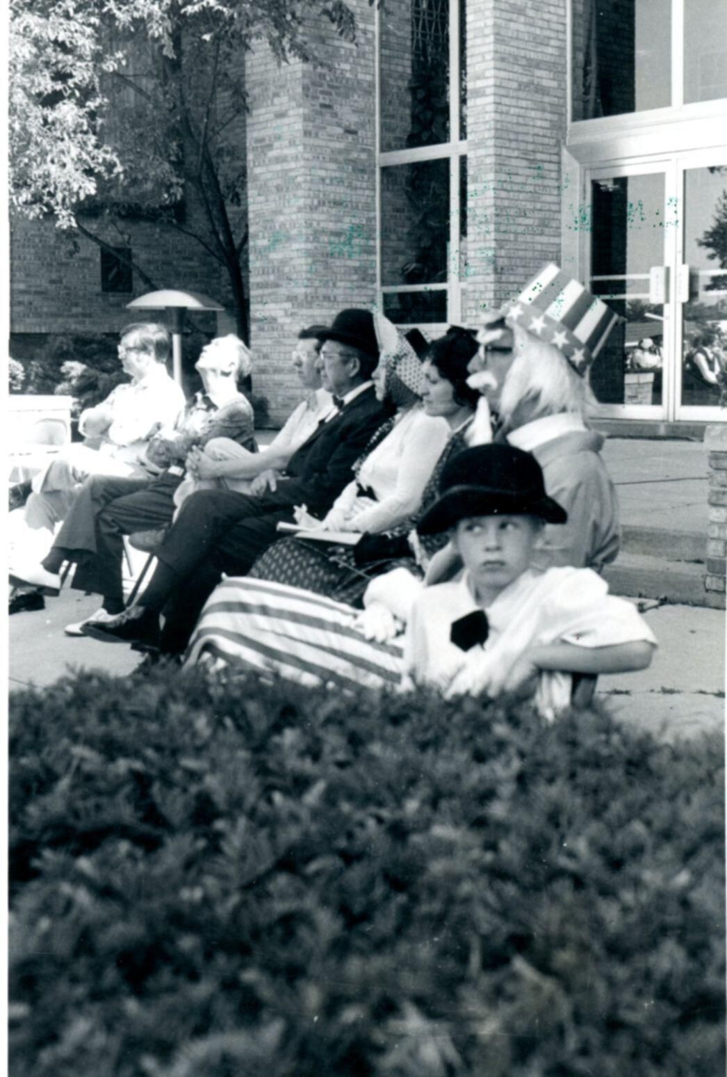 PI212-53 show Uncle Sam (Ed Light) making popcorn with Hila Bross's grandson lookin on at courthouse.
