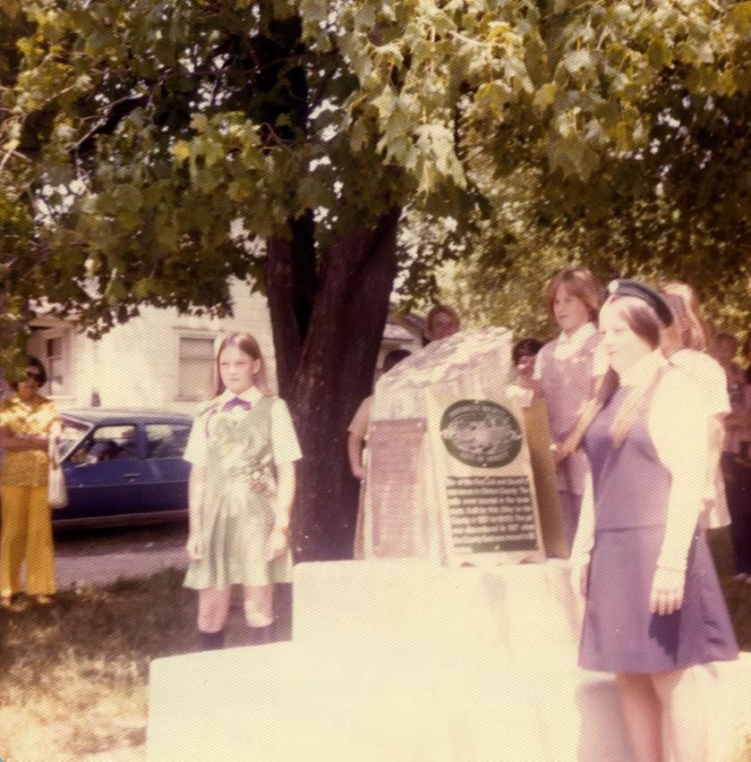 Dated June 8 & 9, 1976. First photo shows Orla McGuire on left with 3 historical plaques (first general store, first county jail, first mill) . The second is the rededication of the David Scott plaque (on the 9th). Photos by Ralph Woodruff.