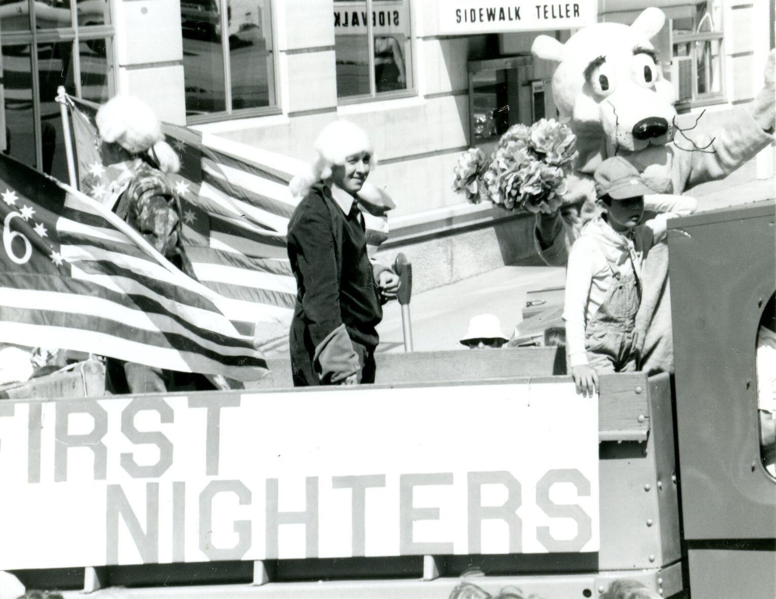 July 4, 1976, bicentennial parade in St. Johns. First Nighters drama troupe. Copy of photo used in Clinton County History (1980) page 638.