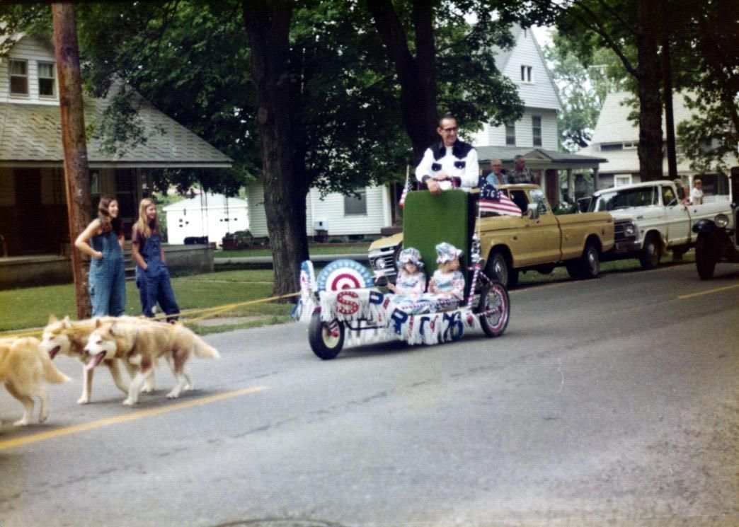 July 3, 1976, parade. Siberian Dog Team with the Richard Ellis family.