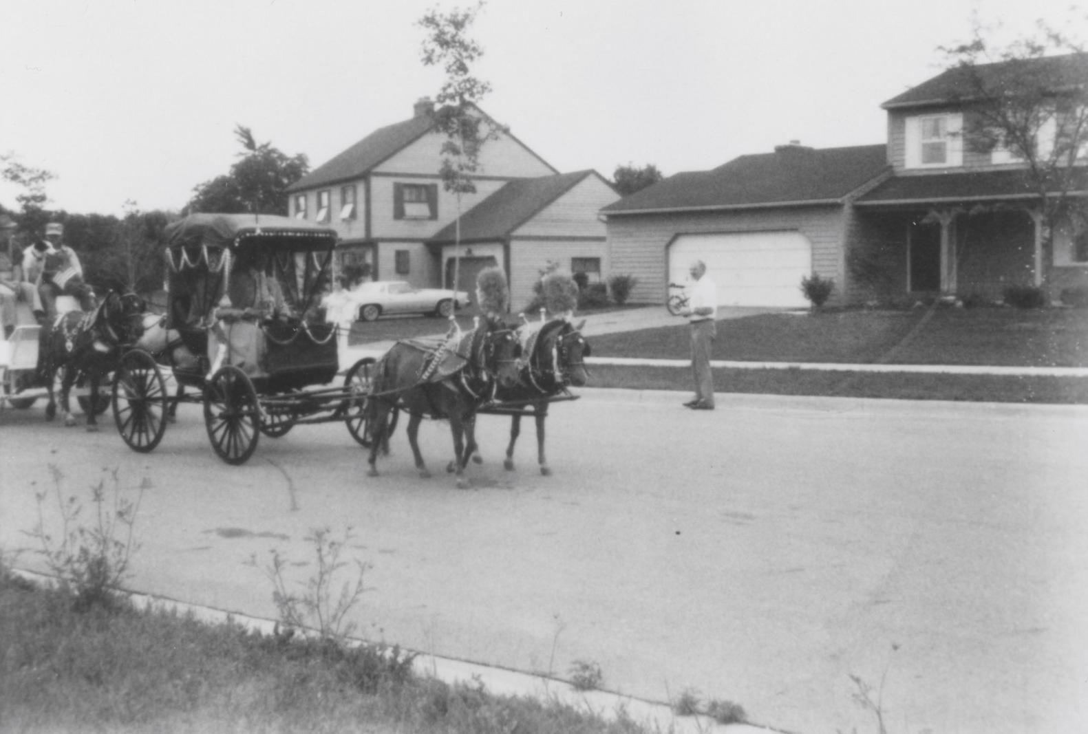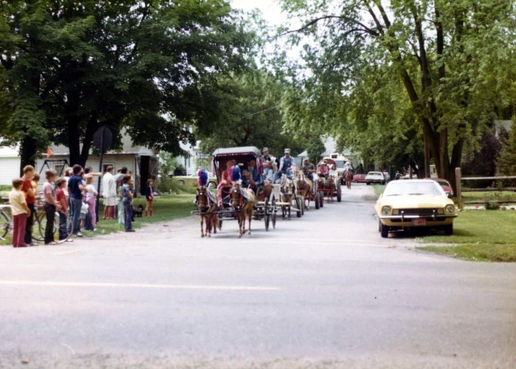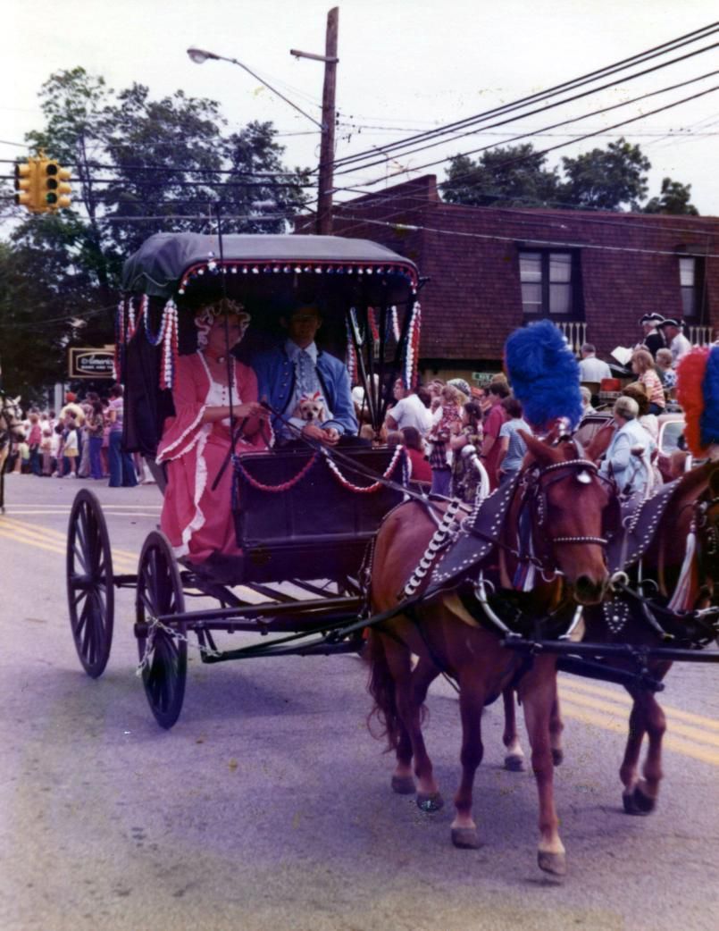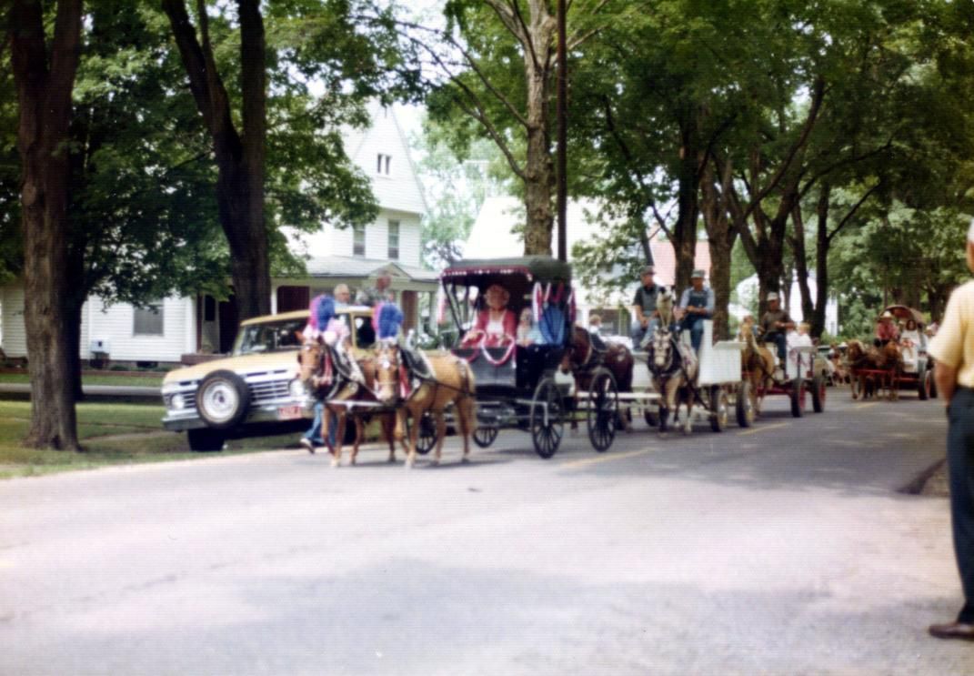 July 3, 1976, parade. This is probably Rosalee Fisher and antique buggy and horses. Behind is the Witt family and Bicentennial Covered Wagon.
