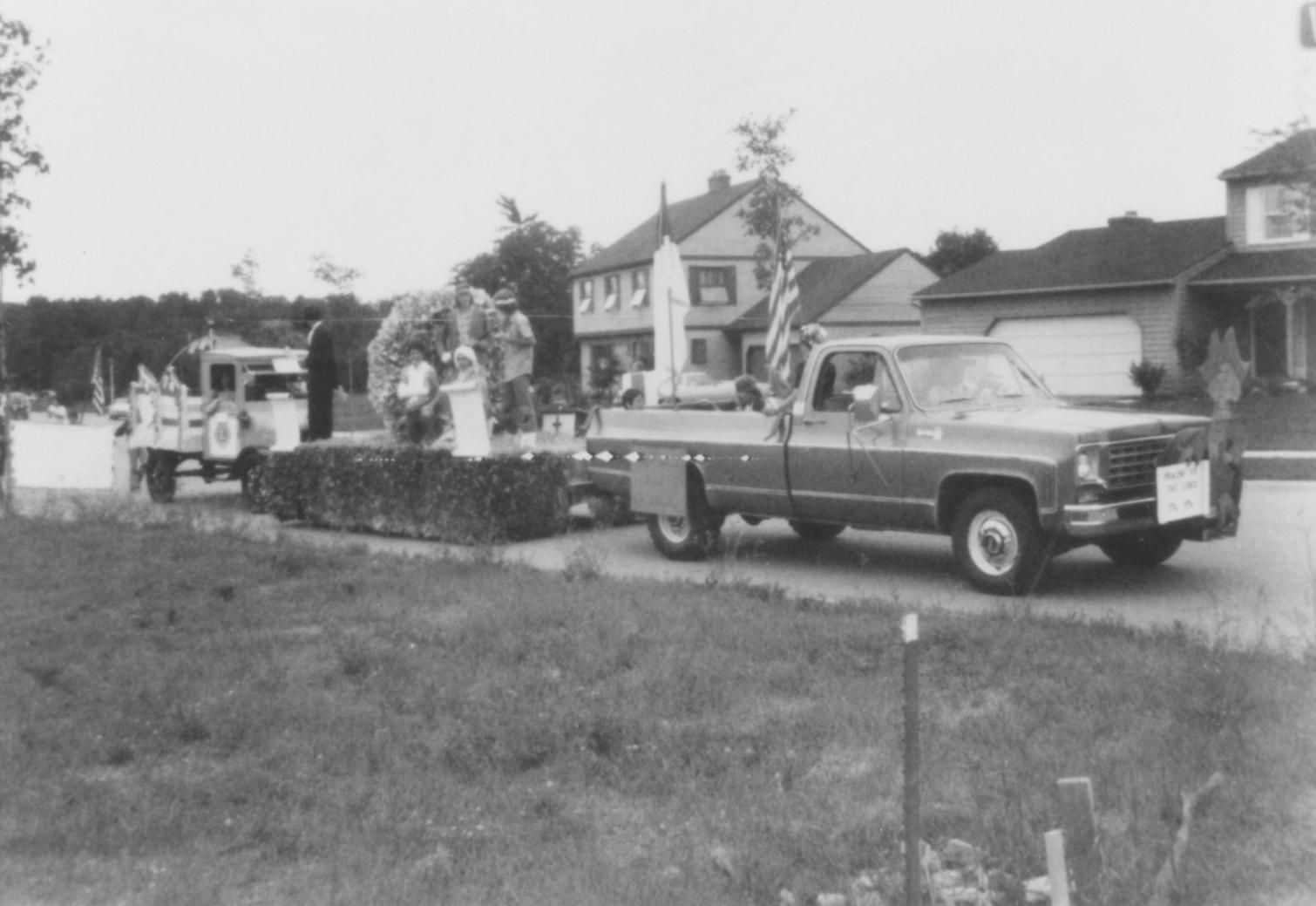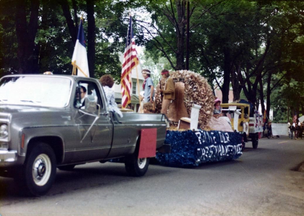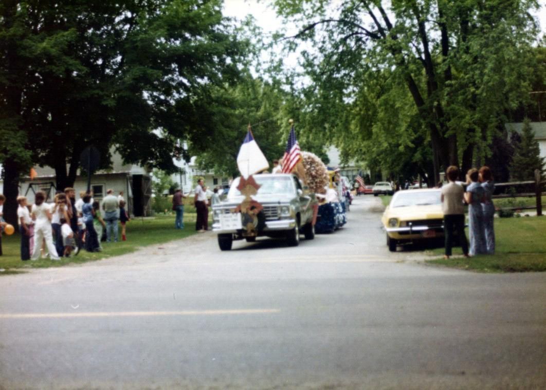 July 3, 1976, parade. DeWitt Community Church float. Followed by DeWitt Lions Club.