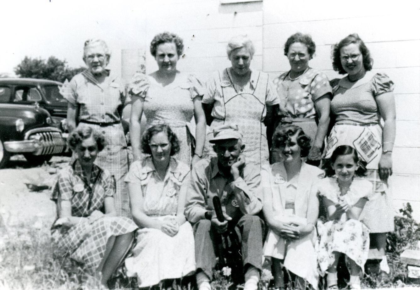Bingham Grange workers c1950. (back) Glenna Peck, Pearl Barnhart, Maude Ballinger, Lilly Parker, Catharine Parker, (front) Irene Fricke, Alice Hiebeck, Howey Ballinger, Nancy Reed, and Gayle Fricke. Copy of photo used in Clinton County History (1980) page 617.