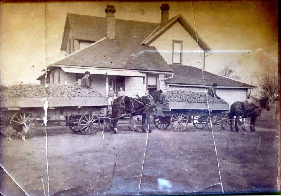 Charles Leman Bishop home at Mead and DeWitt Roads. Wagons have sugar beets.