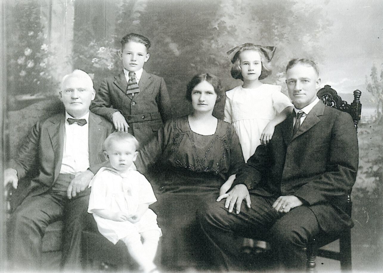 Frank Phillips (father of Grace), Bill Bissell (on stool), Grace (Phillips) and Floyd Bissell, Paul Bissell, Cleo (Bissell) Waigle. 1921, photocopy.