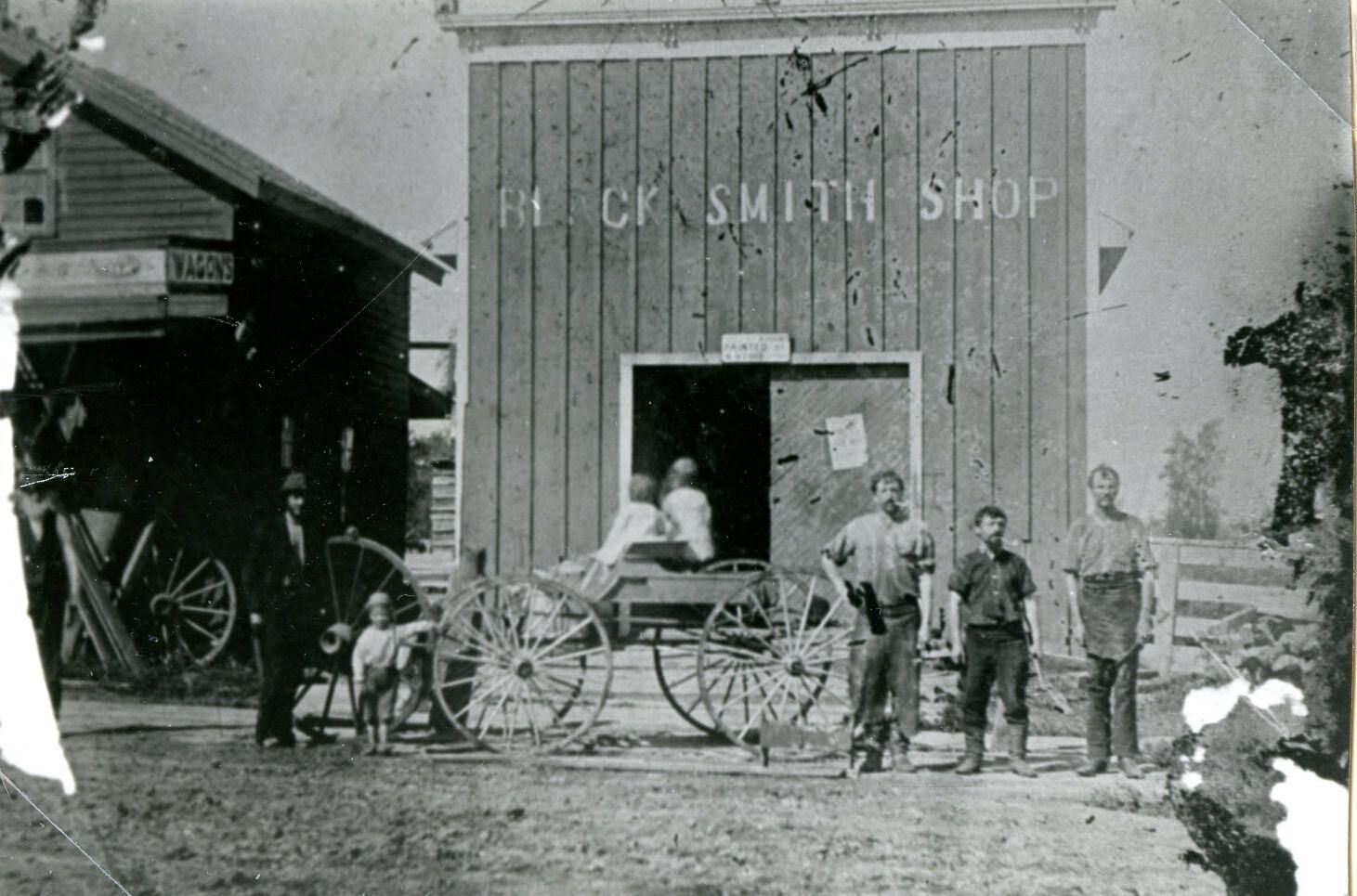Lawrence Martin, -?-, and Adam Hall standing in front of Adam Hall's Wagon Shop and Lawrence Martin's Blacksmith Shop in Fowler, Michigan, in 1880. Copy of photo used in Clinton County History (1980) page 674.