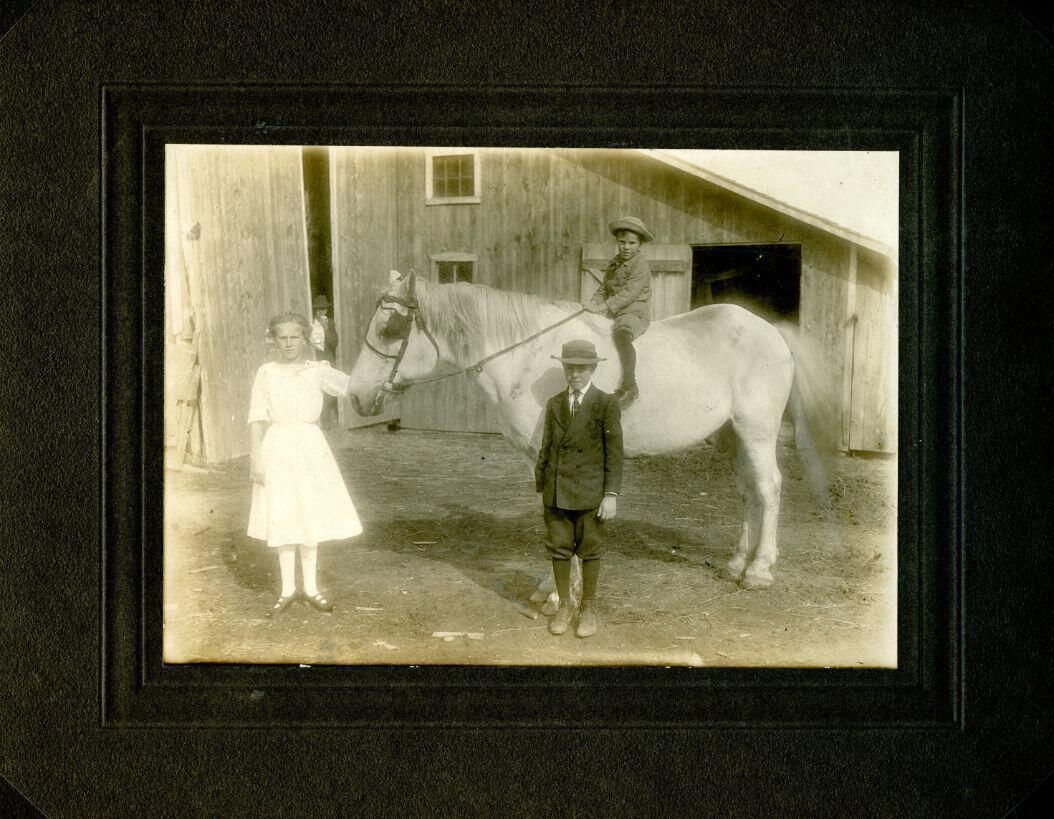Believed to be the George W. Brace farm on NE corner of Bauer and Chadwick, Riley Township. The children are possibly Jane, Orley and Lloyd Brace.