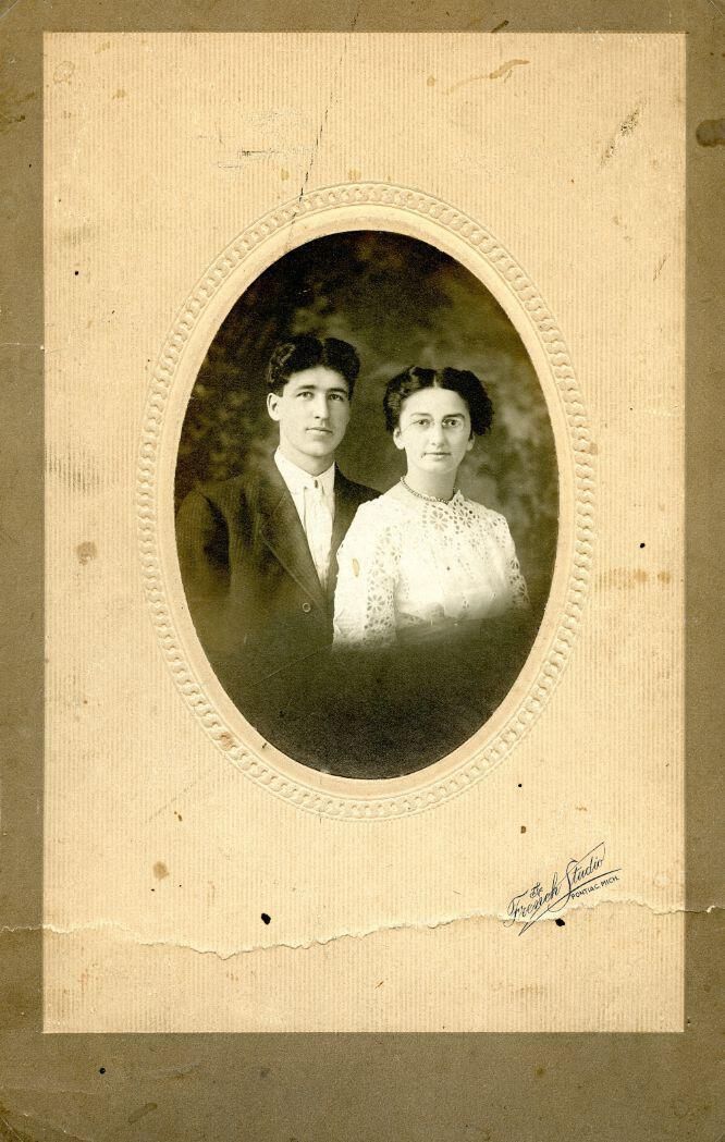 [assumed] Floyd and Rena (Payne) Britten wedding picture. Inscription says "Britten". Photo by French of Pontiac, Michigan.
