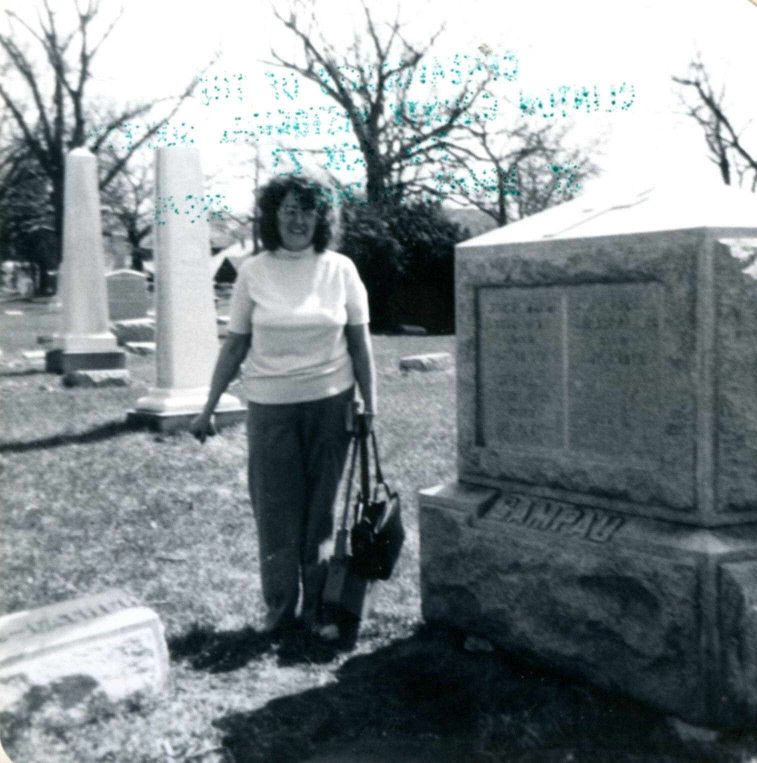 Shirley Karber at Campau grave in Sowle Cemetery.