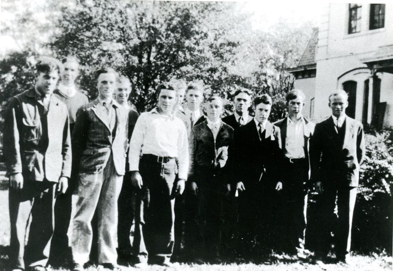 Clinton County boys on courthouse lawn leaving for CCC camp. Among them are A. D. Bancroft, George Harter, Girth Cornell, Charles Loznak, Dale Shiffer, Wilson Higgins, William Simmons, John McClung, Harold Purvis, Donald Hempstead, Arthur Mathews, and Louis Thompson. Copy of photo used in Clinton County History (1980) page 746.