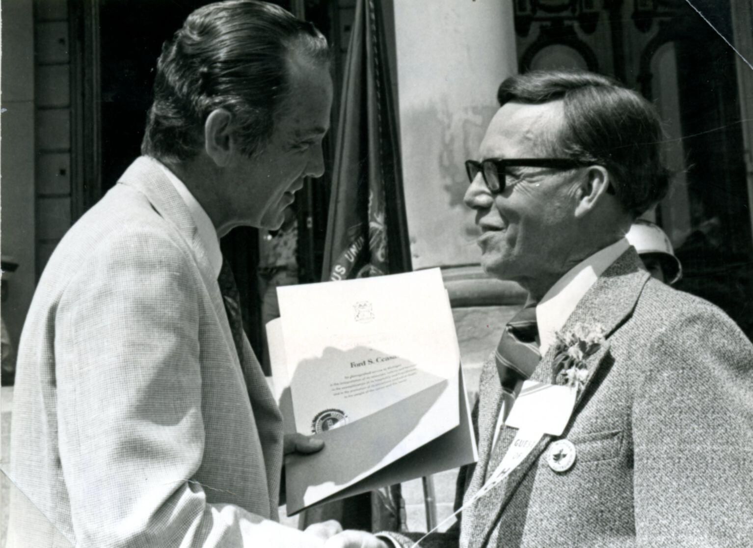 Ford Stevens Ceasar being presented with Michigan Minuteman Award at Capitol by Governor William Milliken, May 25, 1978. From 1980 History of Clinton County page 50.
