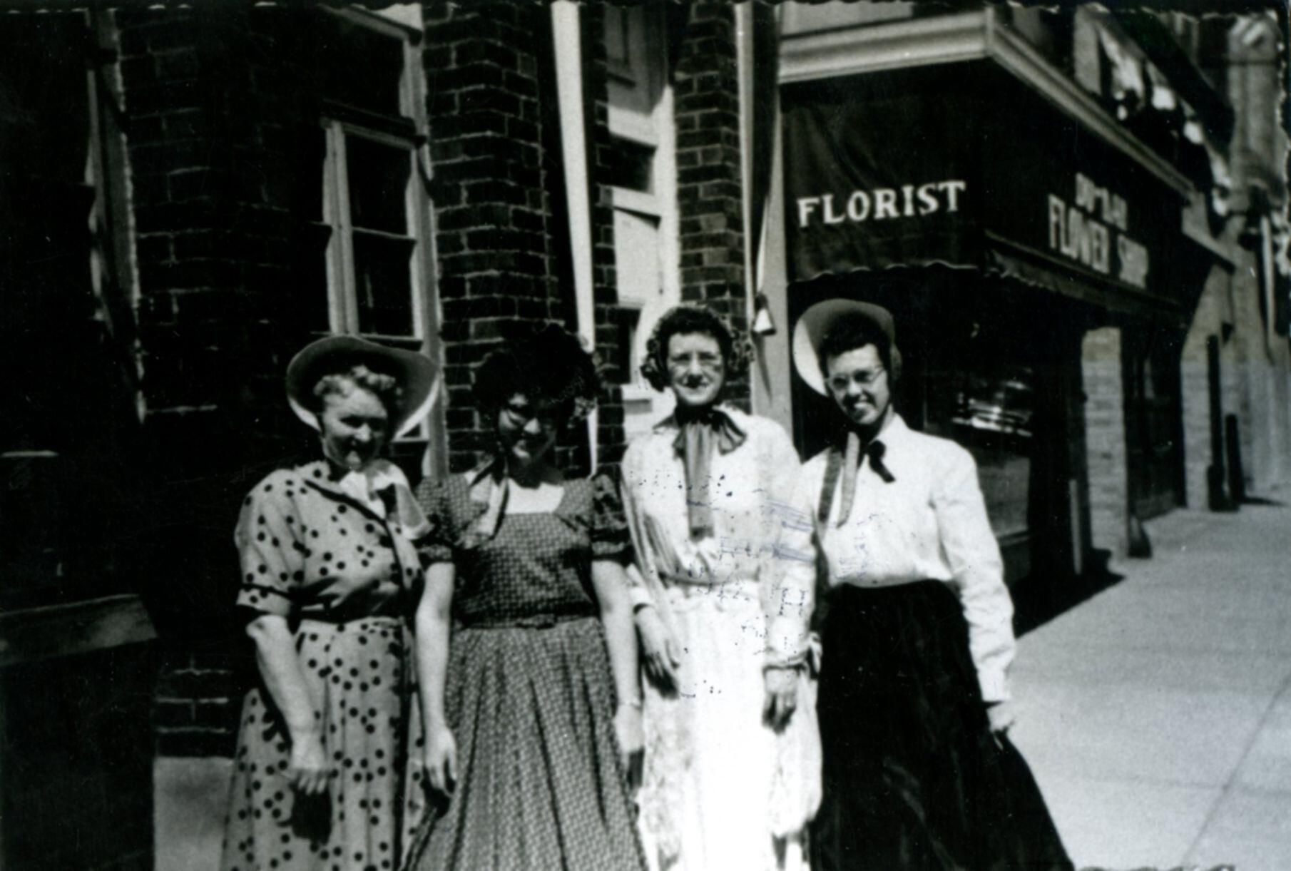 St. Johns Centennial, July 1956. Leota Groom, Janice Rosenkrans Todocuik, Arlene Holden, Jean Martin Nuecterlein.