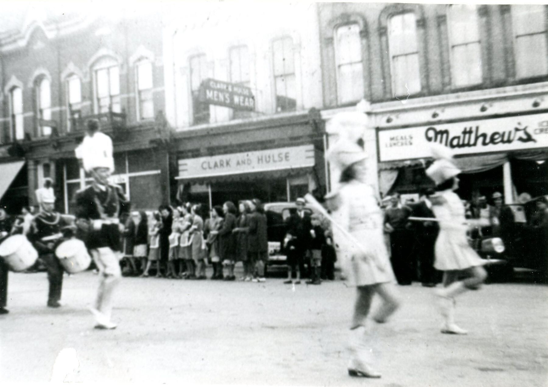 May 19, 1940, St. Johns Citizenship parade past Matthews Dairy and Clark & Hulse. Copy of photo used in Clinton County History (1980) page 679.