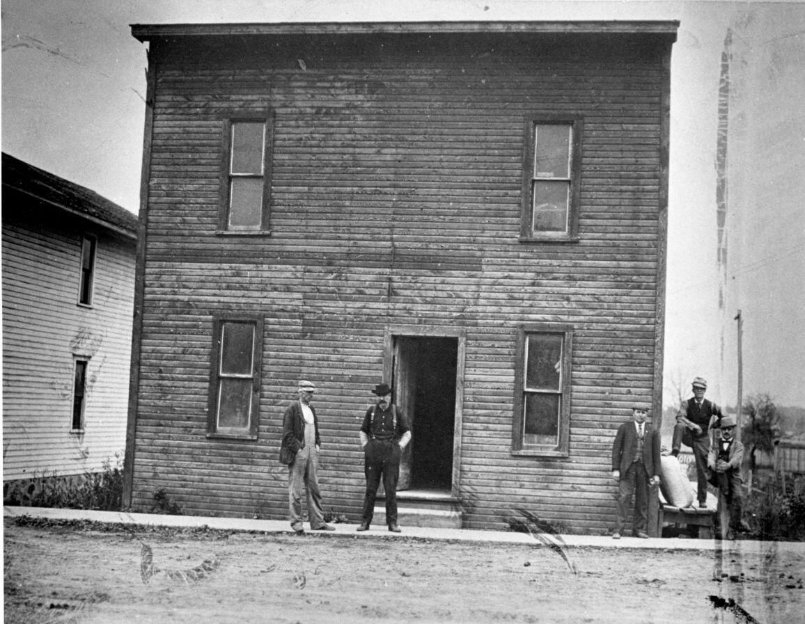 Located on the south side of East Main just west of the Woodman Hall. Not shown to the west was the Calder blacksmith shop. The man next to the door is thought to be Calder. Next to him is believed to be Norris, owner of Norris and Eldridge Hardware. The man with foot on a sack is believed to be Clark Livermore. (Identification by Oliver S. Angell in 1992)Acquisition