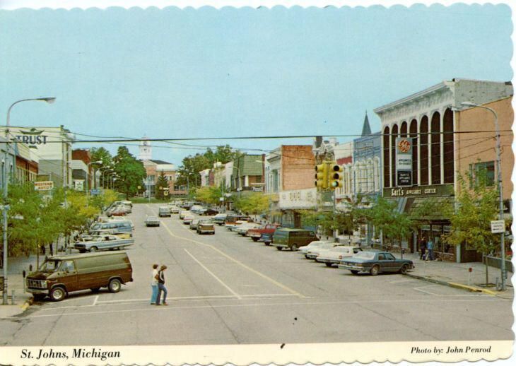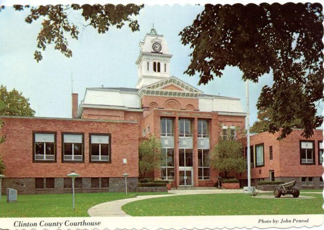 Postcards by Penrod-Hiawatha of Clinton Avenue and the Clinton County Courthouse, 1983. (fair use thumbnails)