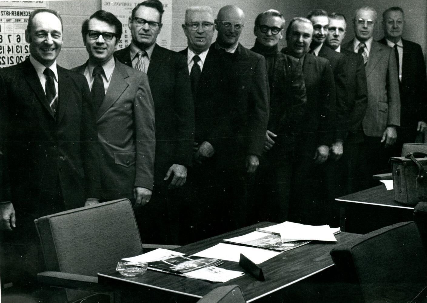 Clinton County Board of Supervisors 1972. Jerry Sheppard, Bob Ditmer, Mori (Maurice) Gove, Darrel Shinaberry, Claude Underhill, Jerry Lankford, Duane Chamberlain, Bob Nobis, William Hufnagle, Bob Montgomery.