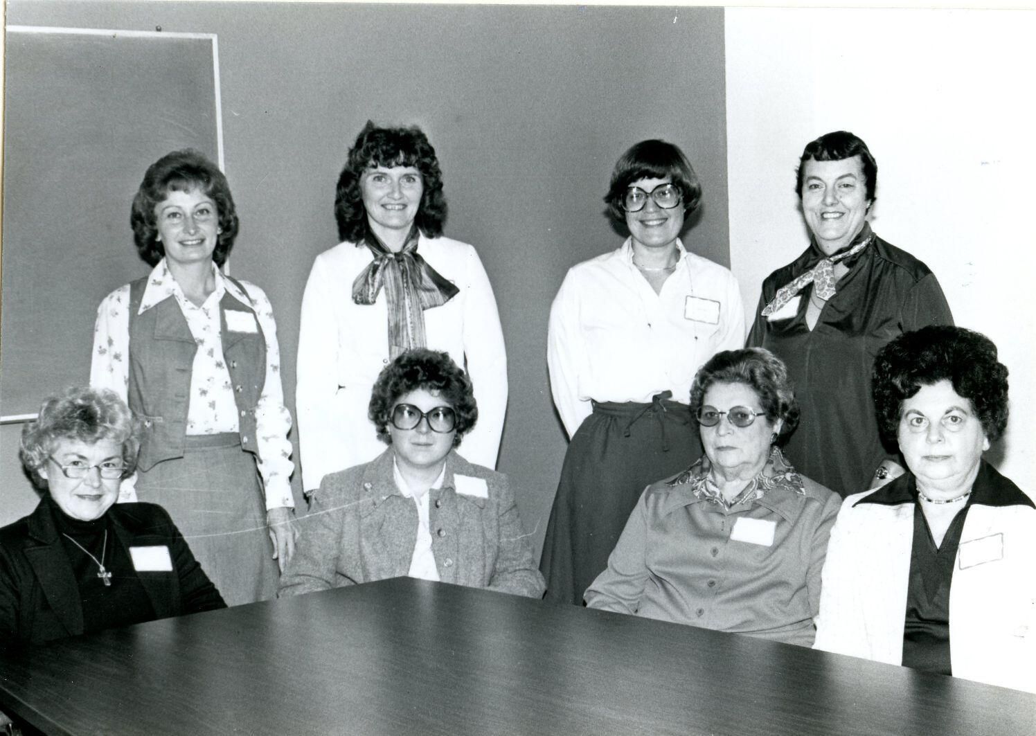 Clinton Memorial Hospital auxiliary officers for 1979. (standing) Nancy Lashaway, Susie Babrato, Dorothy Bakita, Bonnie LaBrie, (sitting) Alma Green, Debra Mikulka, Dorothy Schoals, and Maryann Wieber. Copy of photo used in Clinton County History (1980) page 603.