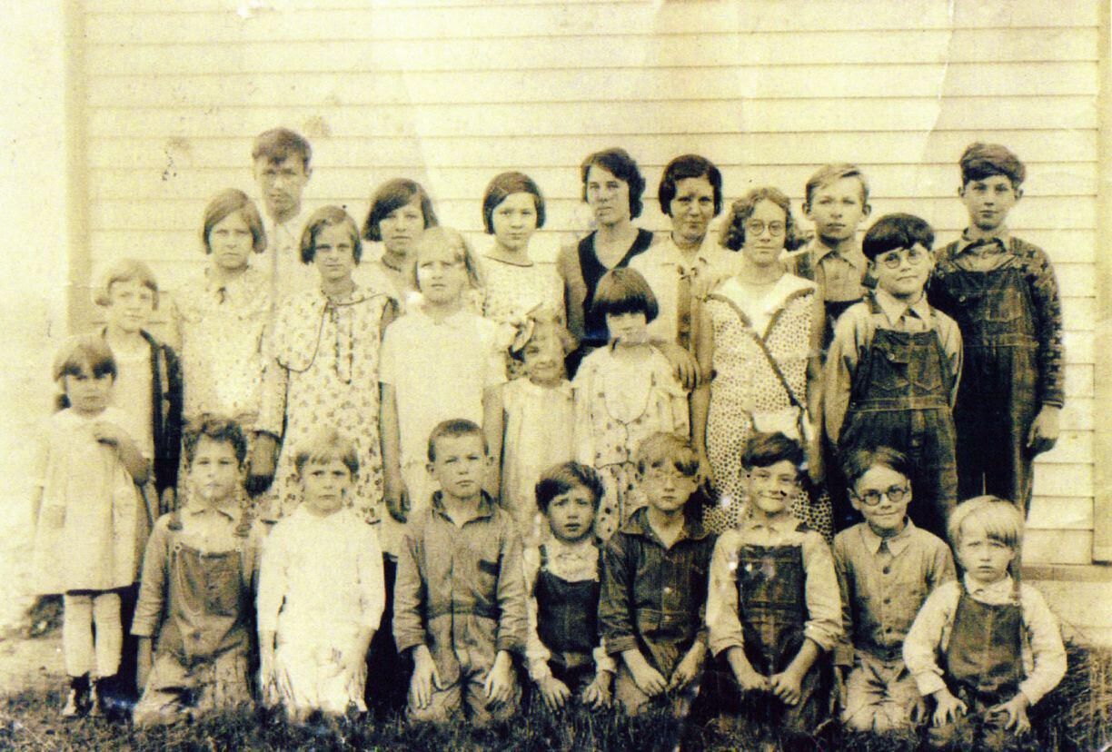 Colony School 1930-1. (back) George Pope, Czachowrski, Roberta Bishop, Flora Welter Hall (teacher), Cordelia Temple, Billy Czchowrski, (middle) Graham, Vena Pope, Nellie Kaufman Washburn, Kathleen Temple, Genevieve Kesby, Loyal Bishop, (front) Geraldine Mueller Moore, Jack Kesby, Harry Graham, R. J. Fivecoats, Walter Kaufman Jr., Lawrence Fivecoats.