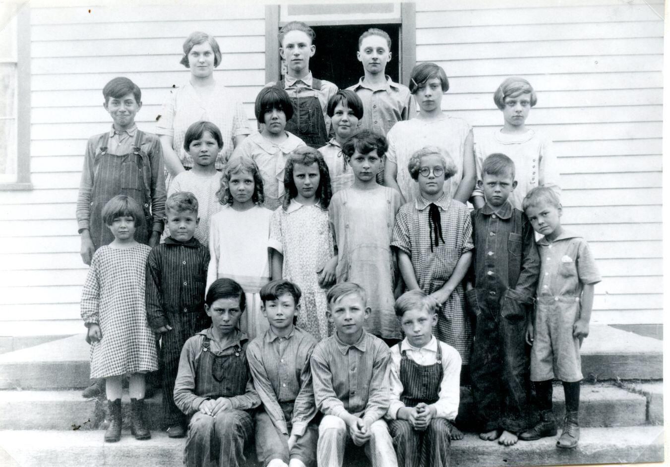 Colony School 1927. Ida Davis Wilson (teacher), Gordon Rosekrans, Willis Hier, Kenneth Walker, Letha Temple, Cordelia Temple, Gladys Hier, Leora Hier, Jack Kesby, Doreen Hier, Genevieve Kesby, Walter Kaufman Jr., Don Walker, Kenneth Olson, Billy Czachowrski.