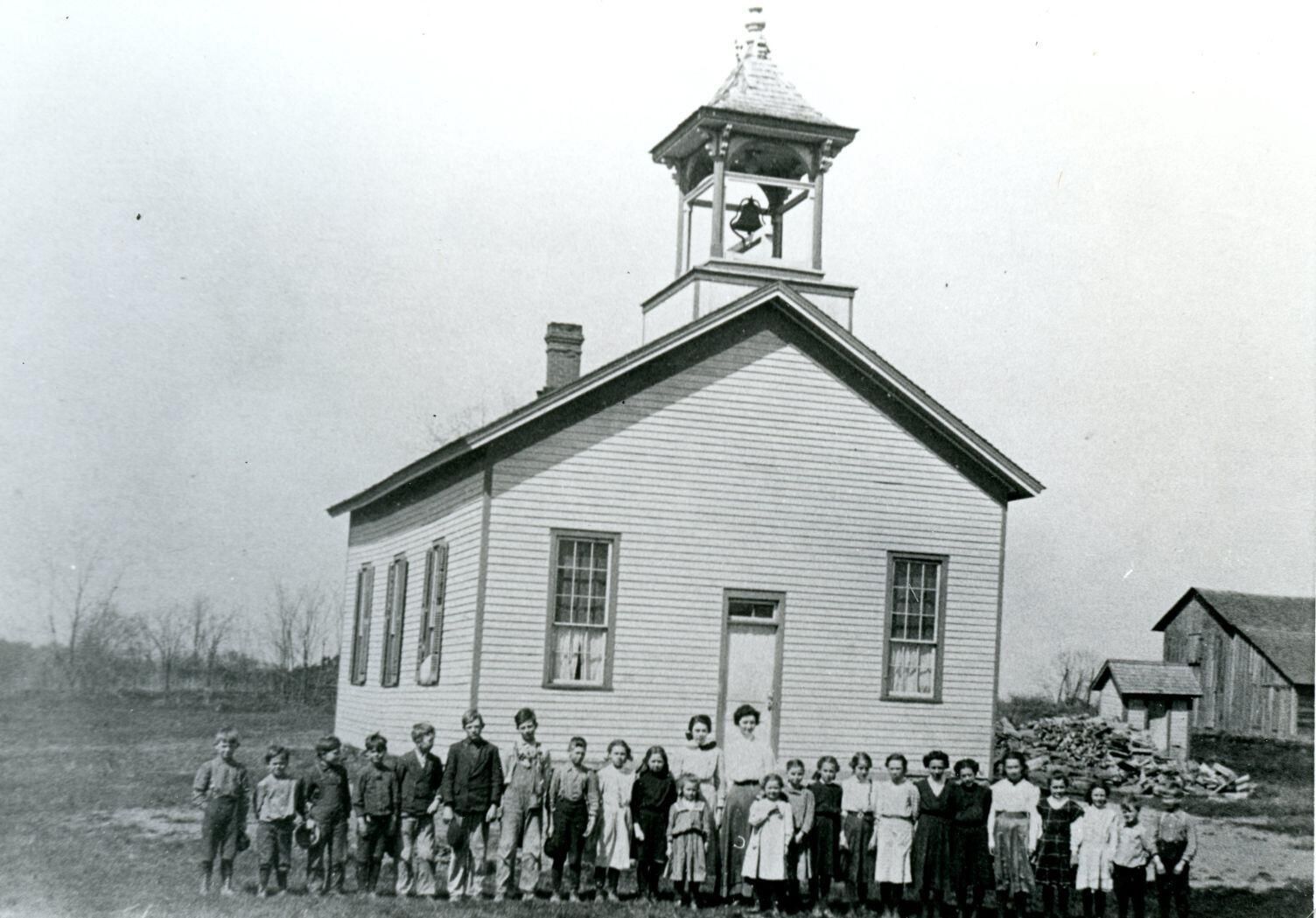 Colony School of Duplain Township 1908-9. The oldest girl standing next to Miss Hathaway (teacher) is Frances Pearl. Other students include Mary Pearl, Esther Pearl Graham, Murial Acre, Orin Acre, and Charles Harmon, Copy of photo used in Clinton County History (1980) page 646.