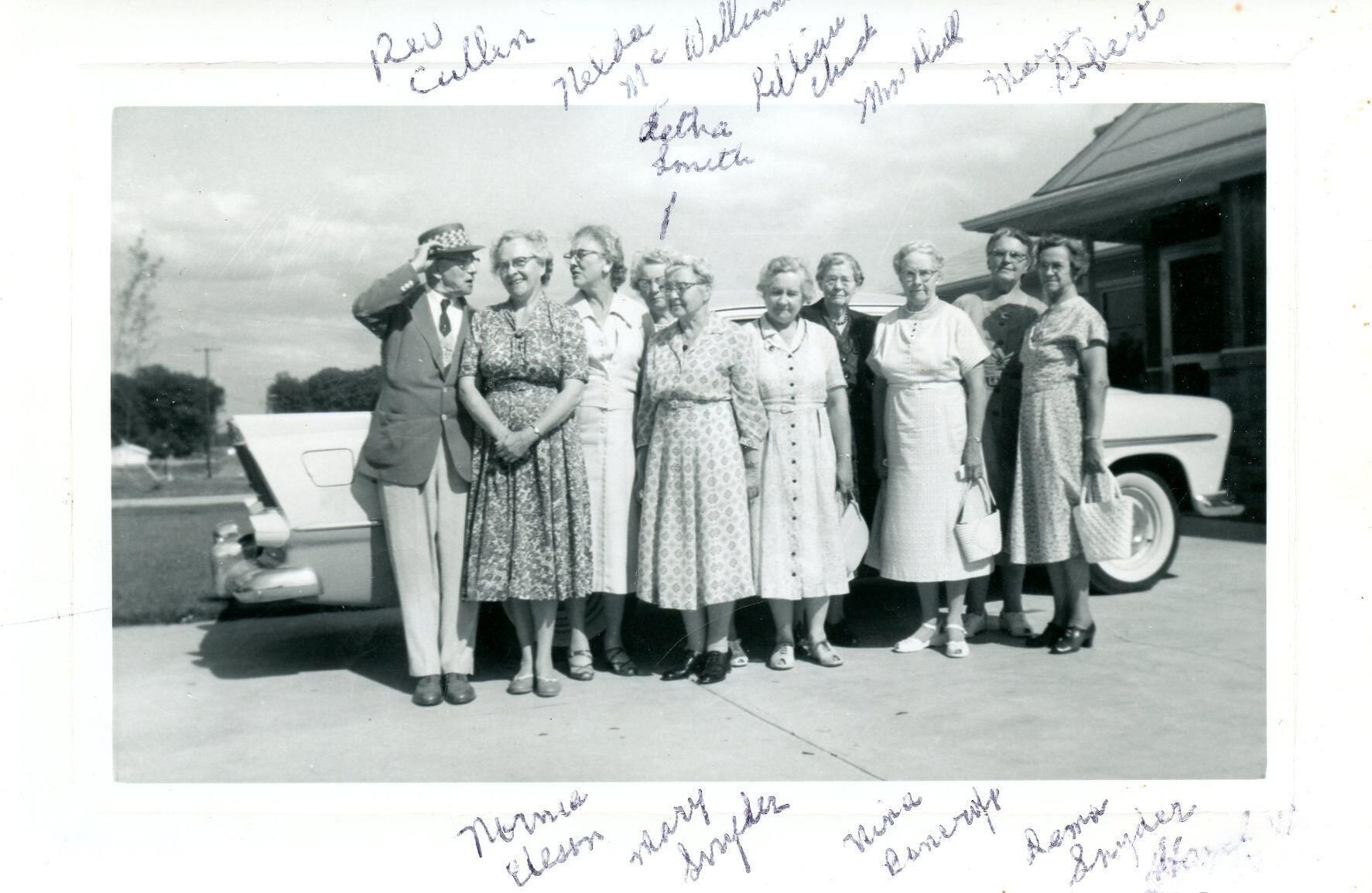 Maple Rapids Congregational Church ladies at the home of Rev. and Mrs. Cullen in Lansing. Rev. Cullen, Norma Eleson, Nelda McWilliams, Letha Smith, Mary Snyder, Lillian Chick, Mrs. Dull, Nina Bancroft, Marie Roberts, and Dema Snyder.