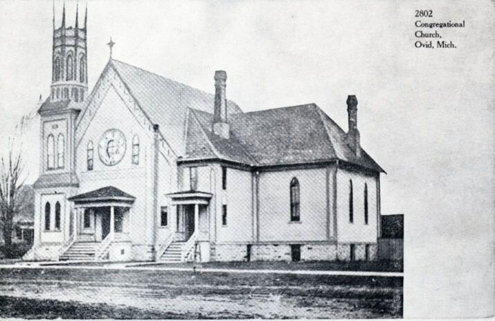 Postcard reproduction by Green Printing of the Ovid Congregational Church. (fair use thumbnail)