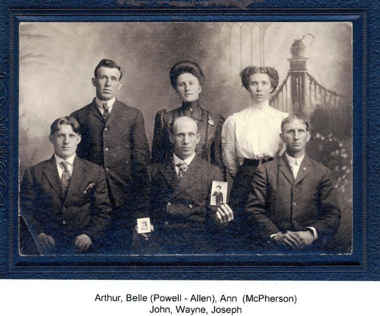 Children of Stephen W. and Sarah E. (Bennett) Cook. Arthur, Belle (Cook) Powell-Allen, Ann (Cook) McPherson, John, Wayne, and Joseph. Holding photos of Loie and Rose. Hier family history.