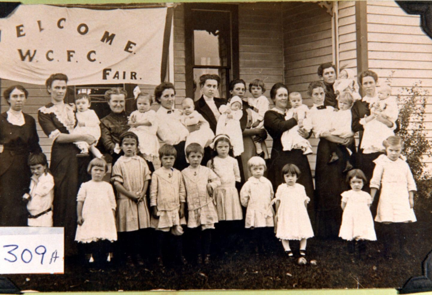 Ladies Aid Society of the County Line Church (later Salem), 8 miles north or St. Johns. Pictured include: Grace and Robert Hankey, Flora and Evelyn Kerns, Edna and Dorothy Beck, Frances and Gordon Patterson, Clara and Clare Rhines, Maud and Carl Bair, Viola and Glendon Beck, and others. copy