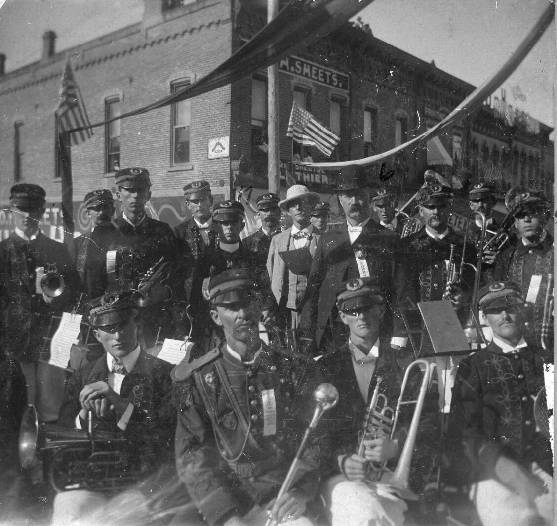 DeWitt Brass Band (DeWitt Cornet or DeWitt Maroon) at Grand Ledge with George Pike, Adam Rose, George Mann, George Moots, Charles Webb, and others not identified (possible Earl VanFleet photo)