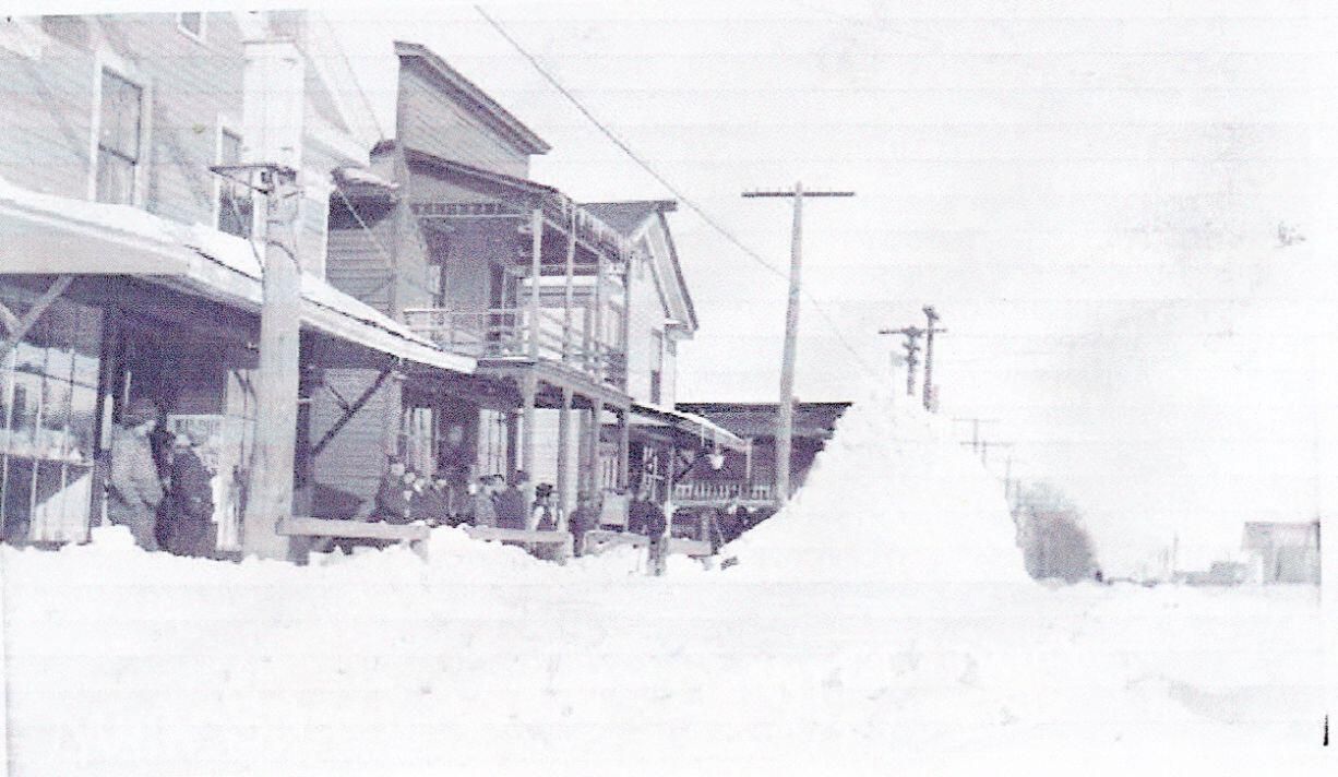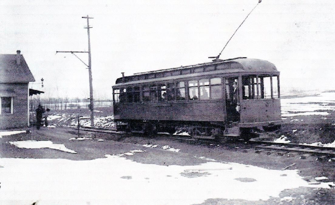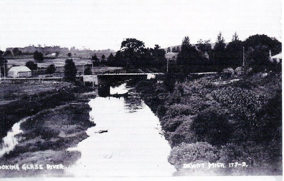 Scans of DeWitt area postcards. 30-A Looking Glass River and bridge; 30-B Shoveling out from a snow storm; 30-C Interurban at Alward Lake; 30-D Baptist Church of DeWitt 1912.
