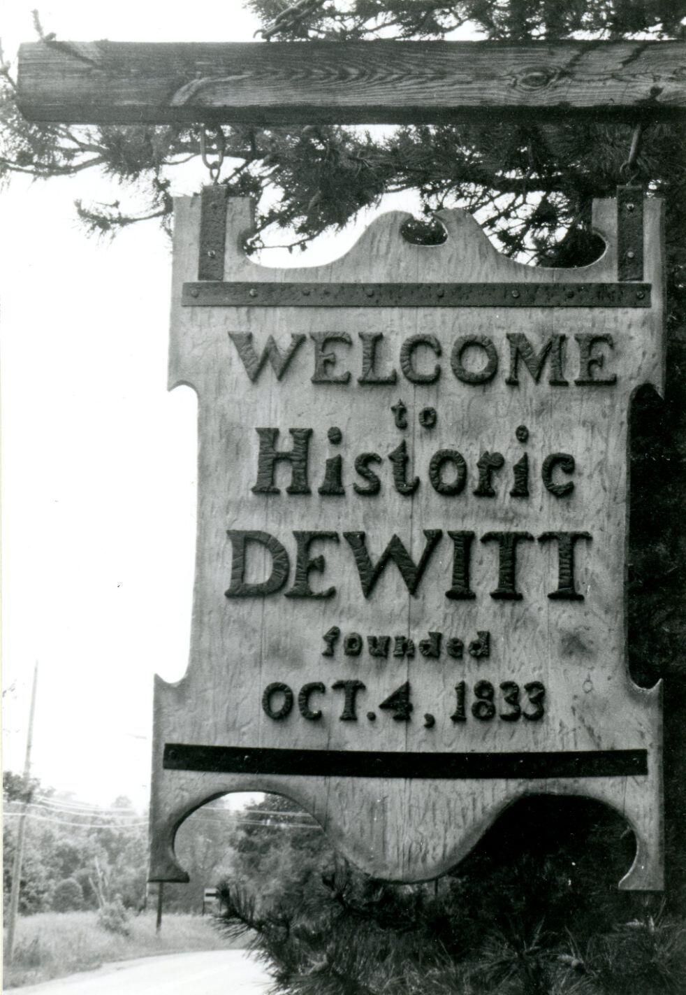 Welcome to Historic DeWitt sign c1980. Sign designed and made by Jake Smeltzer. Copy of photo used in Clinton County History (1980) page 742. 2nd copy PI216-33.