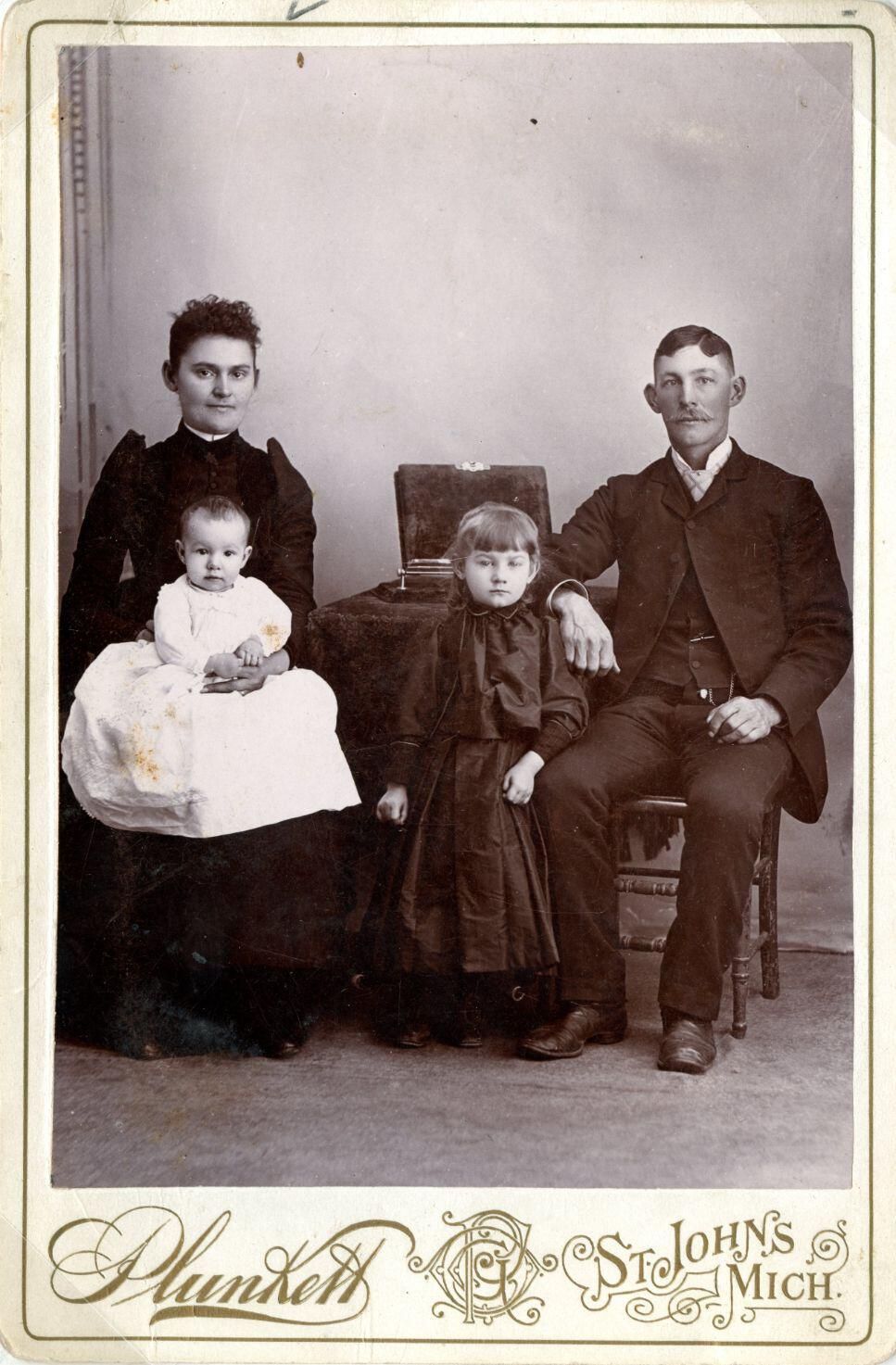 Sarah Ellen "Ella" (Post) and Aaron "Burr" Dexter (brother of Roswell) and daughters Blanche (oldest) and Genevieve "Jennie" Dexter. c1892.