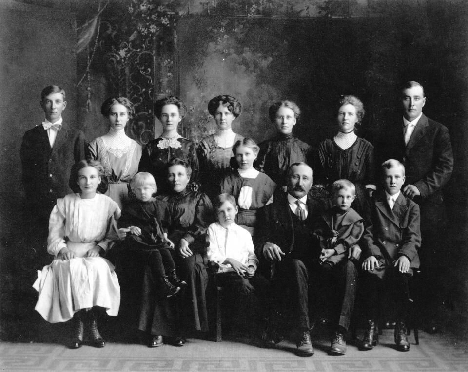William F. and Catherine (Gross) Dunnebacke family. (back) Herman, Edith, Anna Mary, Oliva, Caroline, Frances, Otto M., (seated) Dorothea, Victor, Catherine, Roman William Sr., Carl J. William Jr.