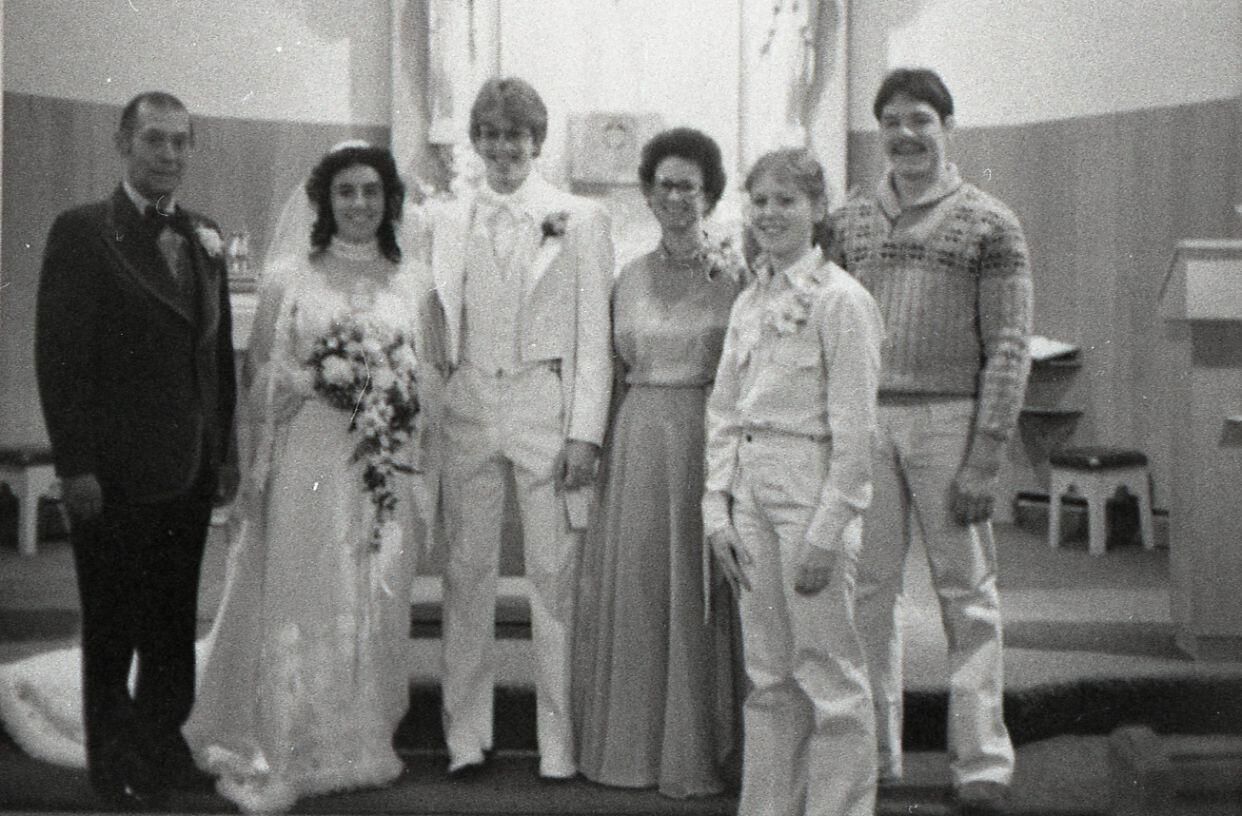 Raymond Eisler family, 1980. Rayond Eisler, Bonnie Rae Myers, Mark L. G. Myers, Merle Donna Eisler, Bonnie Kay Eisler, Joseph Michael Eisler. Scan of negative from 1980 History of Clinton County page 92.